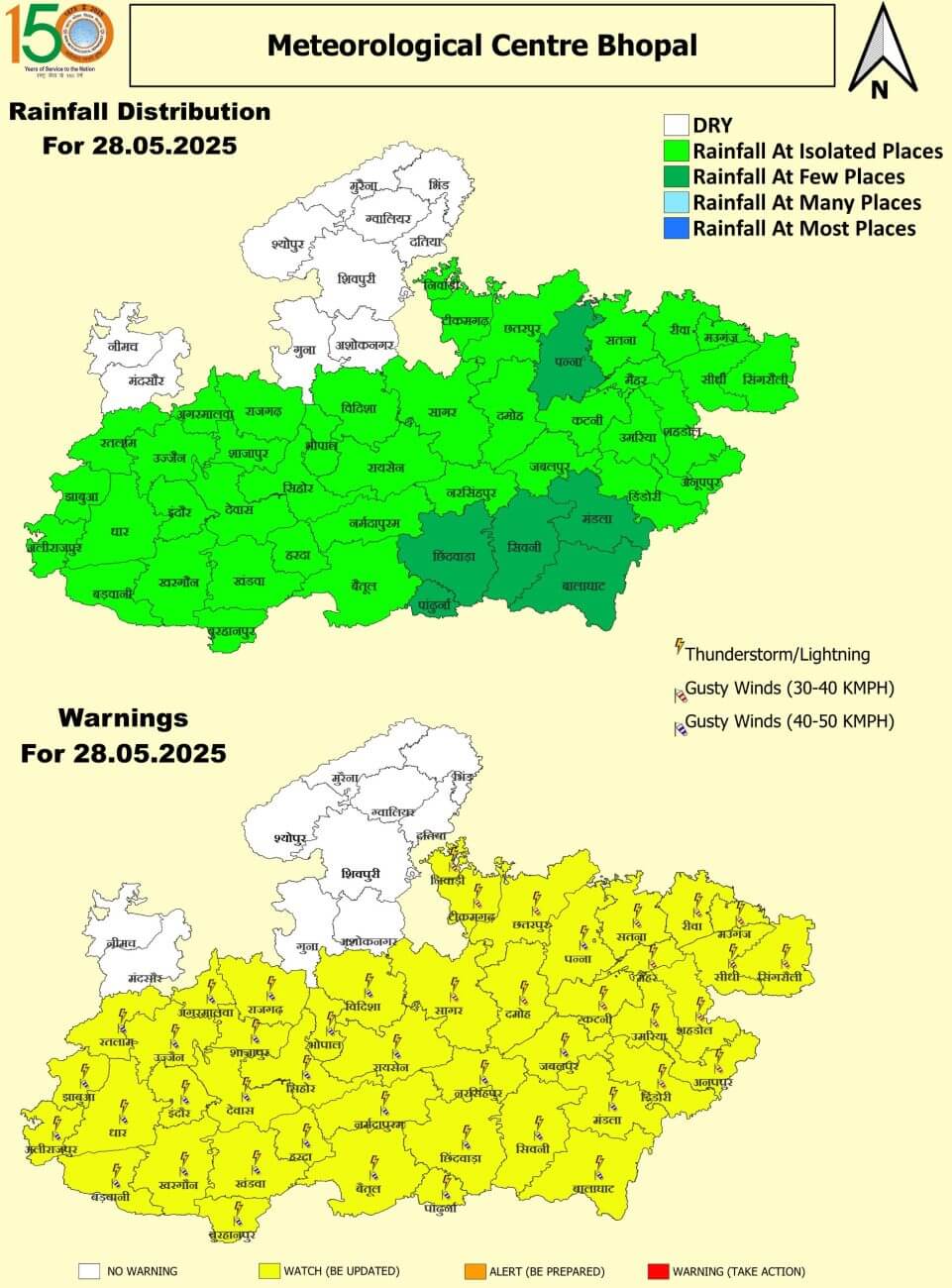 - 28 मई बुधवार: भोपाल, विदिशा, रायसेन, सीहोर, राजगढ़, नर्मदापुरम, बैतूल, हरदा, बुरहानपुर, खंडवा, खरगोन, बड़वानी, अलीराजपुर, झाबुआ, धार, इंदौर, रतलाम, उज्जैन, देवास, शाजापुर, आगर, जबलपुर, नरसिंहपुर, छिंदवाड़ा, सिवनी, मंडला, बालाघाट, पन्ना, पांढुर्णा जिलों में 40 से 50 किलोमीटर की रफ्तार से हवाएं ।सिंगरौली, सीधी, रीवा, मऊगंज, सतना, अनूपपुर, शहडोल, उमरिया, डिंडोरी, कटनी, दमोह, सागर, छतरपुर, टीकमगढ़, निवाड़ी, मैहर में 30 से 40 किमी की रफ्तार से हवाएं ।