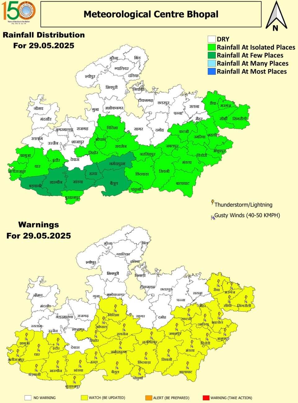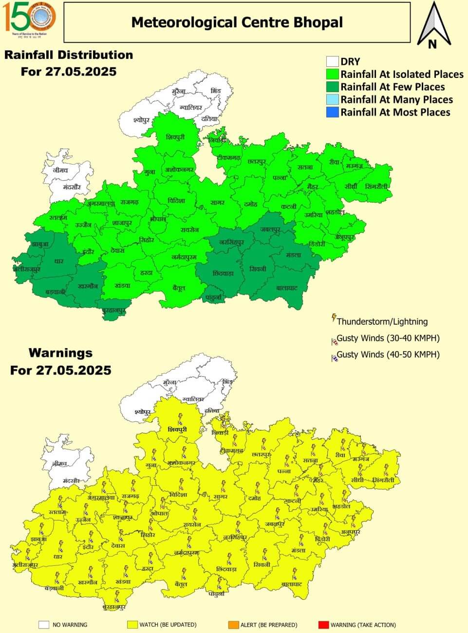 - 27 मई मंगलवार: नर्मदापुरम, बैतूल, हरदा, बुरहानपुर, खंडवा, खरगोन, बड़वानी, अलीराजपुर, झाबुआ, धार, इंदौर, रतलाम, उज्जैन, देवास, शाजापुर, आगर मालवा, गुना, अशोकनगर, शिवपुरी, जबलपुर, नरसिंहपुर, छिंदवाड़ा, सिवनी, मंडला, बालाघाट पांढुर्णा जिलों में 50 KMPH तक हवा।
