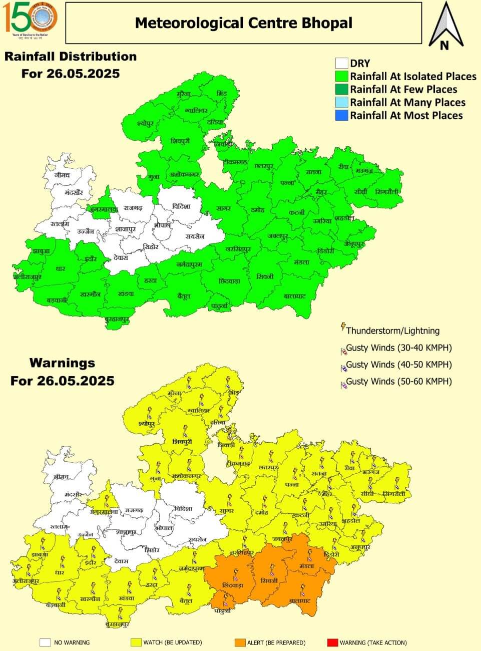 - 26 मई सोमवार: छिंदवाड़ा, सिवनी, मंडला, बालाघाट, पांढुर्णा में ऑरेंज अलर्ट। कहीं-कहीं 50 से 60 KMPH आंधी । नर्मदापुरम, बैतूल, हरदा, बुरहानपुर, खंडवा, खरगोन, बड़वानी, अलीराजपुर, झाबुआ, धार, इंदौर, गुना, अशोकनगर, शिवपुरी, ग्वालियर, दतिया, भिंड, मुरैना, श्योपुरकलां, सिंगरौली, सीधी, मऊगंज, सतना, अनूपपुर, शहडोल, उमरिया, डिंडोरी, कटनी, जबलपुर, नरसिंहपुर, आगर, पन्ना, सागर, छतरपुर, टीकमगढ़, निवाड़ी,मैहर जिले में 40 से 50 किलोमीटर की रफ्तार से आंधी।