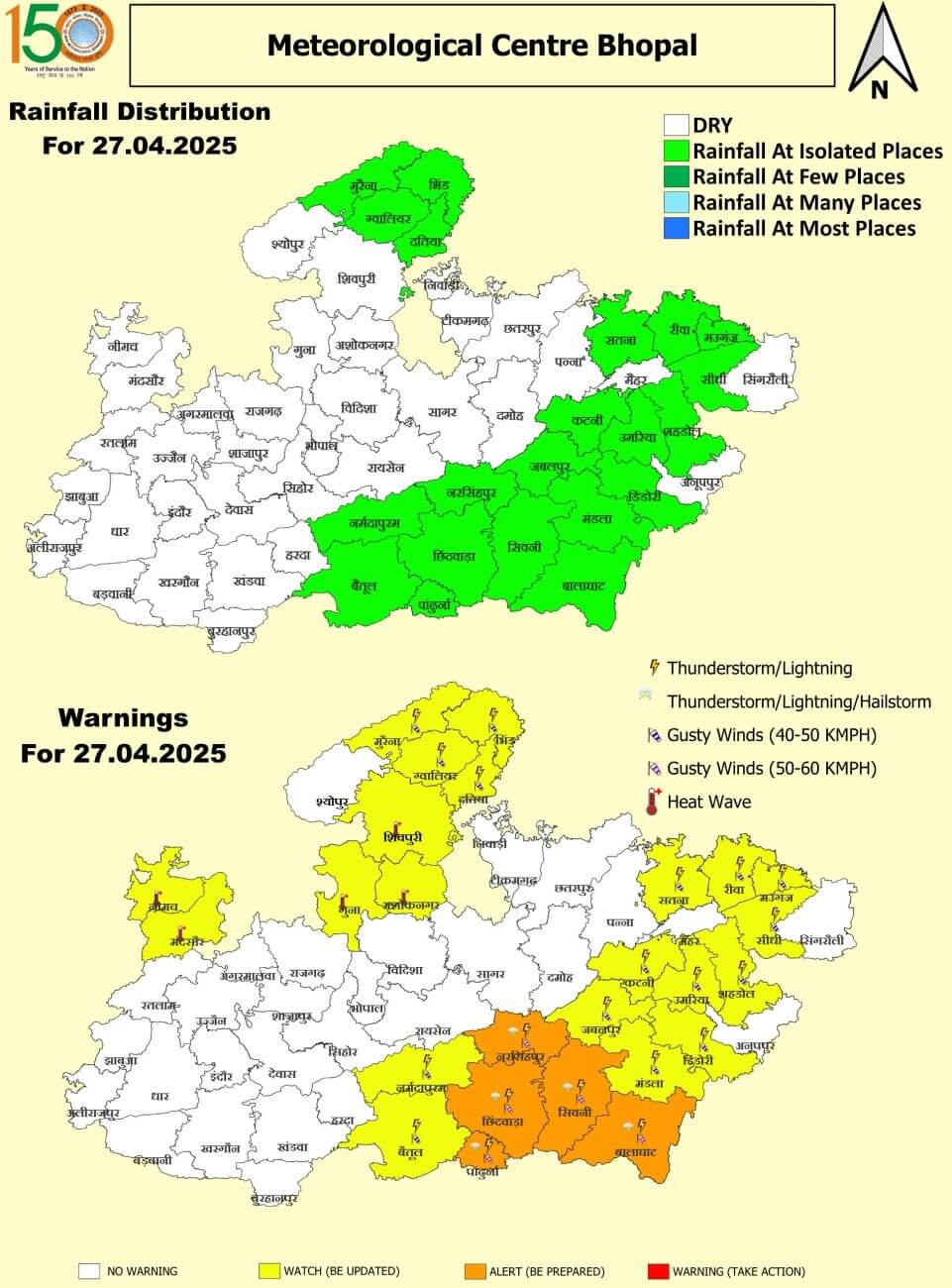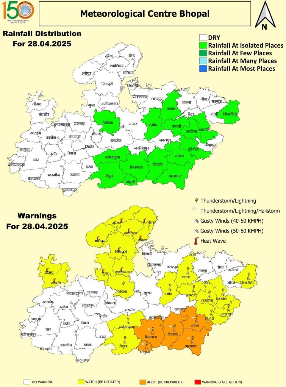 - 28 अप्रैल: सतना, रीवा, मऊगंज, सीधी, सिंगरौली, मैहर,उमरिया, शहडोल, अनूपपुर, डिंडौरी, मंडला, बालाघाट, सिवनी, छिंदवाड़ा और पांढुर्णा में हल्की बारिश ।श्योपुर, नीमच, मंदसौर, रतलाम और झाबुआ में लू।