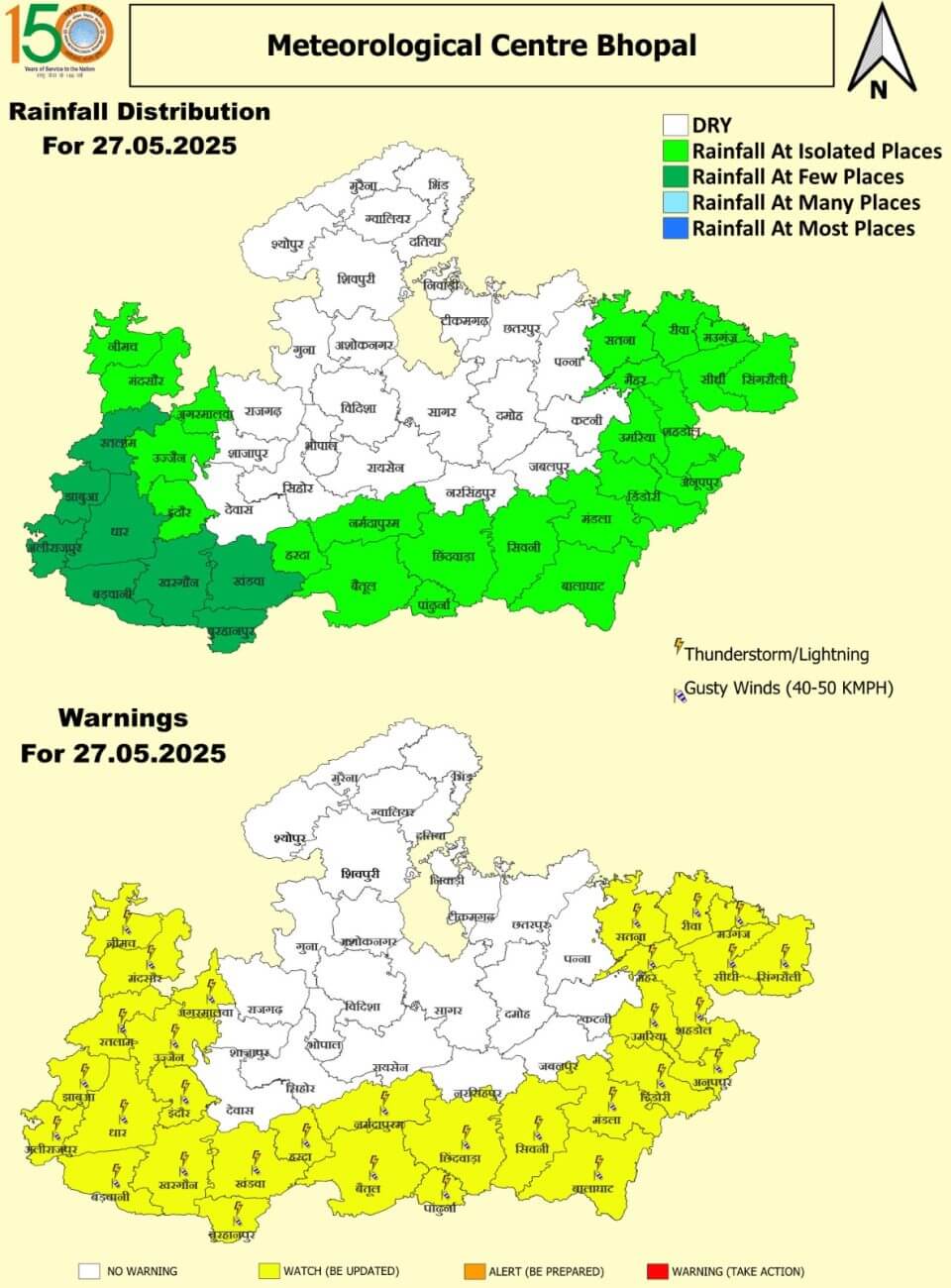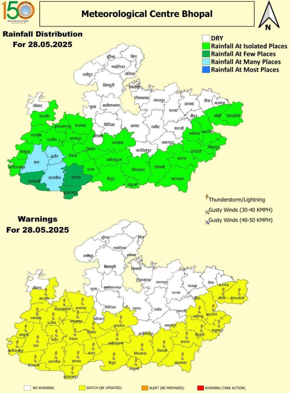 28 मई बुधवार: इंदौर, उज्जैन, मंदसौर, रतलाम, झाबुआ,अलीराजपुर, बड़वानी, धार, आगर-मालवा, खरगोन, बुरहानपुर, खंडवा, हरदा, देवास, सीहोर, शाजापुर, राजगढ़, रायसेन, नर्मदापुरम, बैतूल, छिंदवाड़ा, पांढुर्णा, सिवनी, बालाघाट, मंडला, डिंडौरी, अनूपपुर, उमरिया, शहडोल, सीधी और सिंगरौली में तेज आंधी/बारिश ।