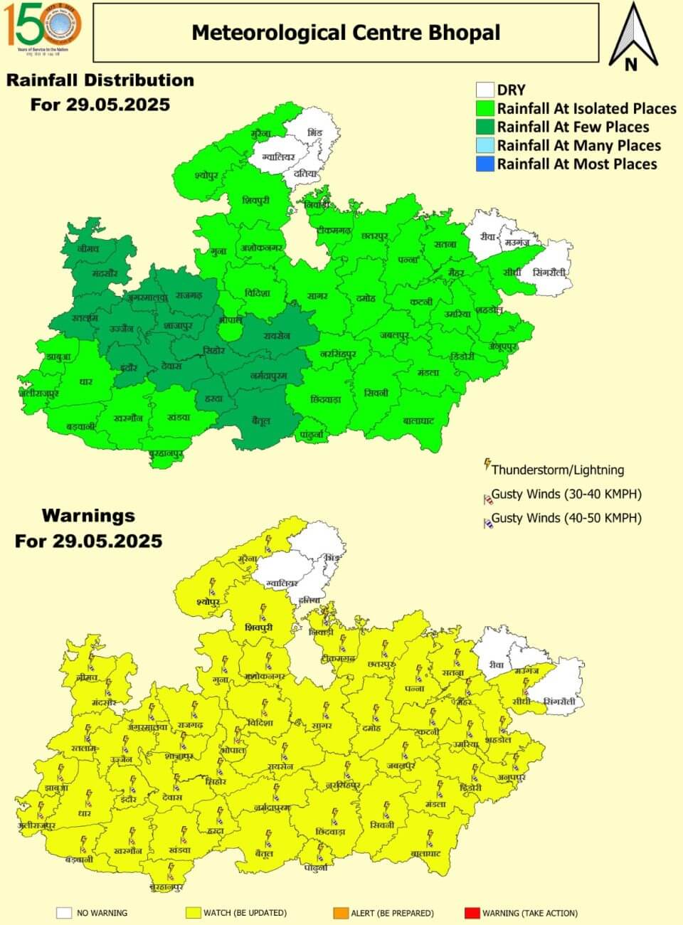 29 मई गुरूवार: भोपाल, इंदौर, उज्जैन, मुरैना, निवाड़ी,टीकमगढ़, छतरपुर, सीधी, पन्ना, दमोह, मंडला, बालाघाट, सिवनी, पांढुर्णा, छिंदवाड़ा, नरसिंहपुर, सागर, विदिशा, रायसेन, नर्मदापुरम, बैतूल, हरदा, सीहोर, शाजापुर, देवास, खंडवा, बुरहानपुर, खरगोन, बड़वानी, धार, अलीराजपुर, झाबुआ, रतलाम, मंदसौर, श्योपुर, शिवपुरी, अशोकनगर, गुना, राजगढ़, आगर-मालवा, सतना, मैहर, मऊगंज, कटनी, जबलपुर, उमरिया, शहडोल, अनूपपुर, डिंडौरी और नीमच में बारिश /हवा की रफ्तार 30 से 50 किलोमीटर प्रतिघंटा तक।