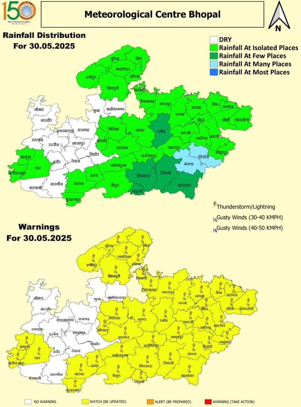 30 मई शुक्रवार: ग्वालियर, मुरैना, भिंड, दतिया, निवाड़ी,टीकमगढ़, छतरपुर, रीवा, सीधी, सिंगरौली, पन्ना, दमोह, मंडला, बालाघाट, सिवनी, पांढुर्णा, छिंदवाड़ा, नरसिंहपुर, सागर, विदिशा, रायसेन, नर्मदापुरम, बैतूल, हरदा, खंडवा, बुरहानपुर, धार, अलीराजपुर, झाबुआ, श्योपुर, शिवपुरी, सतना, मैहर, मऊगंज, कटनी, जबलपुर, उमरिया, शहडोल, अनूपपुर, डिंडौरी में बारिश /हवा की रफ्तार 30 से 50 किलोमीटर प्रतिघंटा तक।