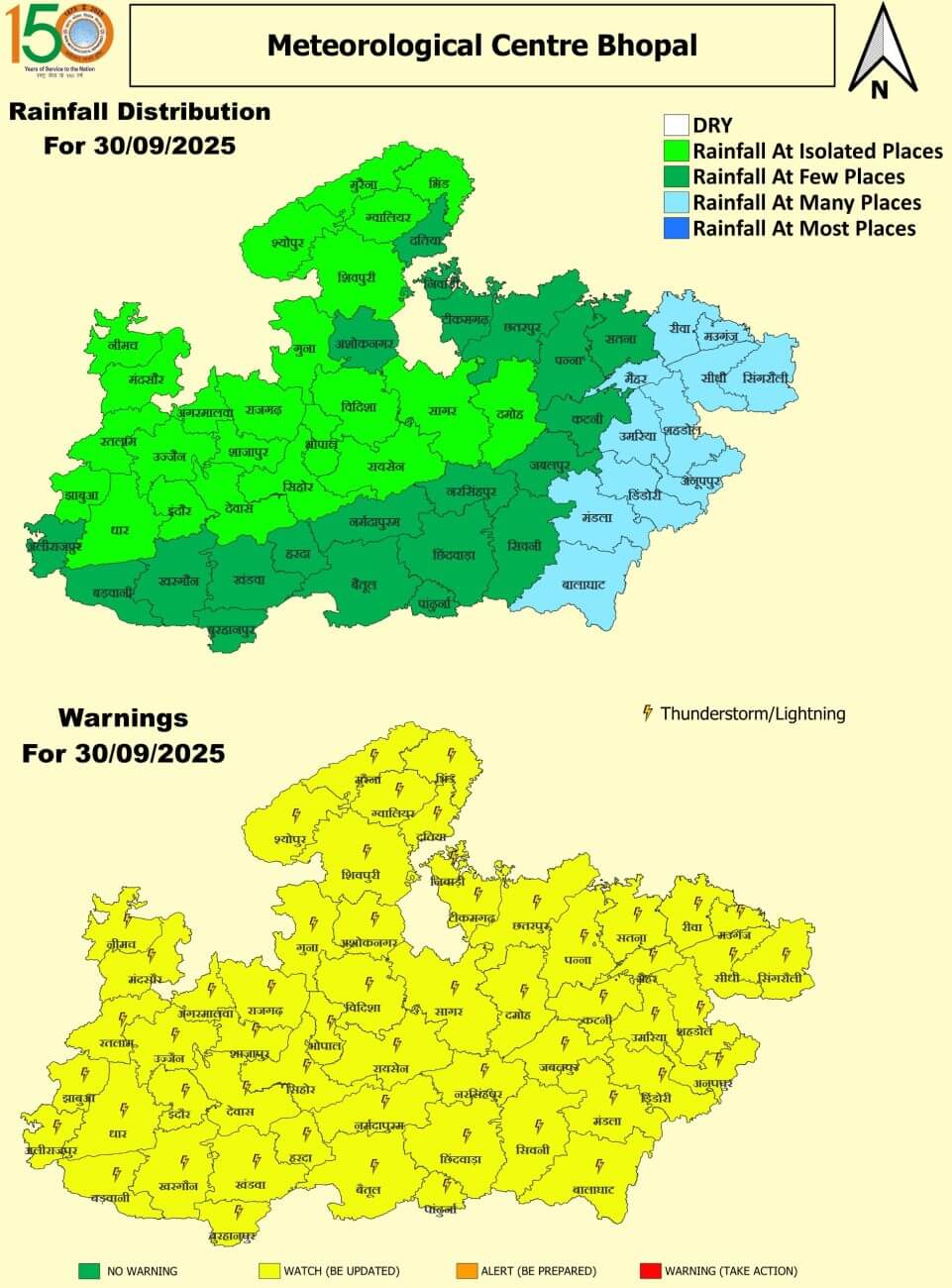 MP Weather Forecast : मध्य प्रदेश में अबतक 12 जिलों से मानसून की विदाई हो चुकी है लेकिन अलग स्थानों पर सक्रिय मौसम प्रणालियों के असर से पूर्वी और दक्षिण-पश्चिमी जिलों में वर्षा हो रही है। आज रविवार को इंदौर संभाग में कहीं-कहीं भारी वर्षा तो भोपाल, नर्मदापुरम, सागर, जबलपुर, शहडोल और रीवा संभाग के जिलों में गरज-चमक के साथ हल्की से मध्यम वर्षा की चेतावनी जारी की गई है। फिलहाल 2 अक्टूबर तक मौसम का मिजाज यूही बना रहेगा। इधर, 30 सितंबर को उत्तरी अंडमान सागर में हवा के ऊपरी भाग में चक्रवात बनकर 1 अक्टूबर को उत्तरी बंगाल की खाड़ी तक पहुंचकर कम दबाव का क्षेत्र बना सकता है।प्रदेश में अब तक औसत 44.1 इंच बारिश हो चुकी है। प्रदेश की सामान्य बारिश औसत 37 इंच है।