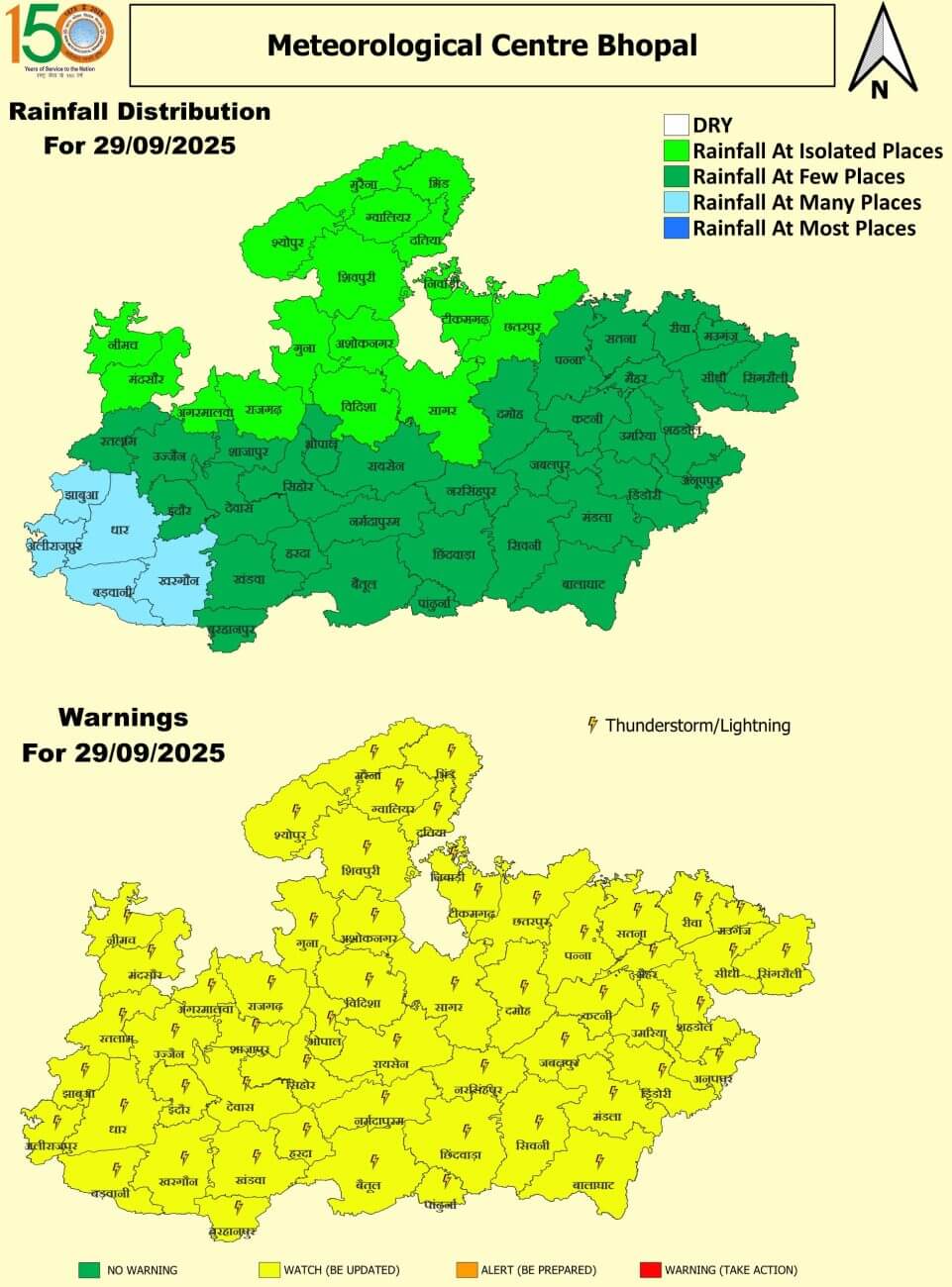 - भोपाल, नर्मदापुरम, सागर, जबलपुर, शहडोल और रीवा संभाग के जिलों में गरज-चमक के साथ हल्की से मध्यम वर्षा