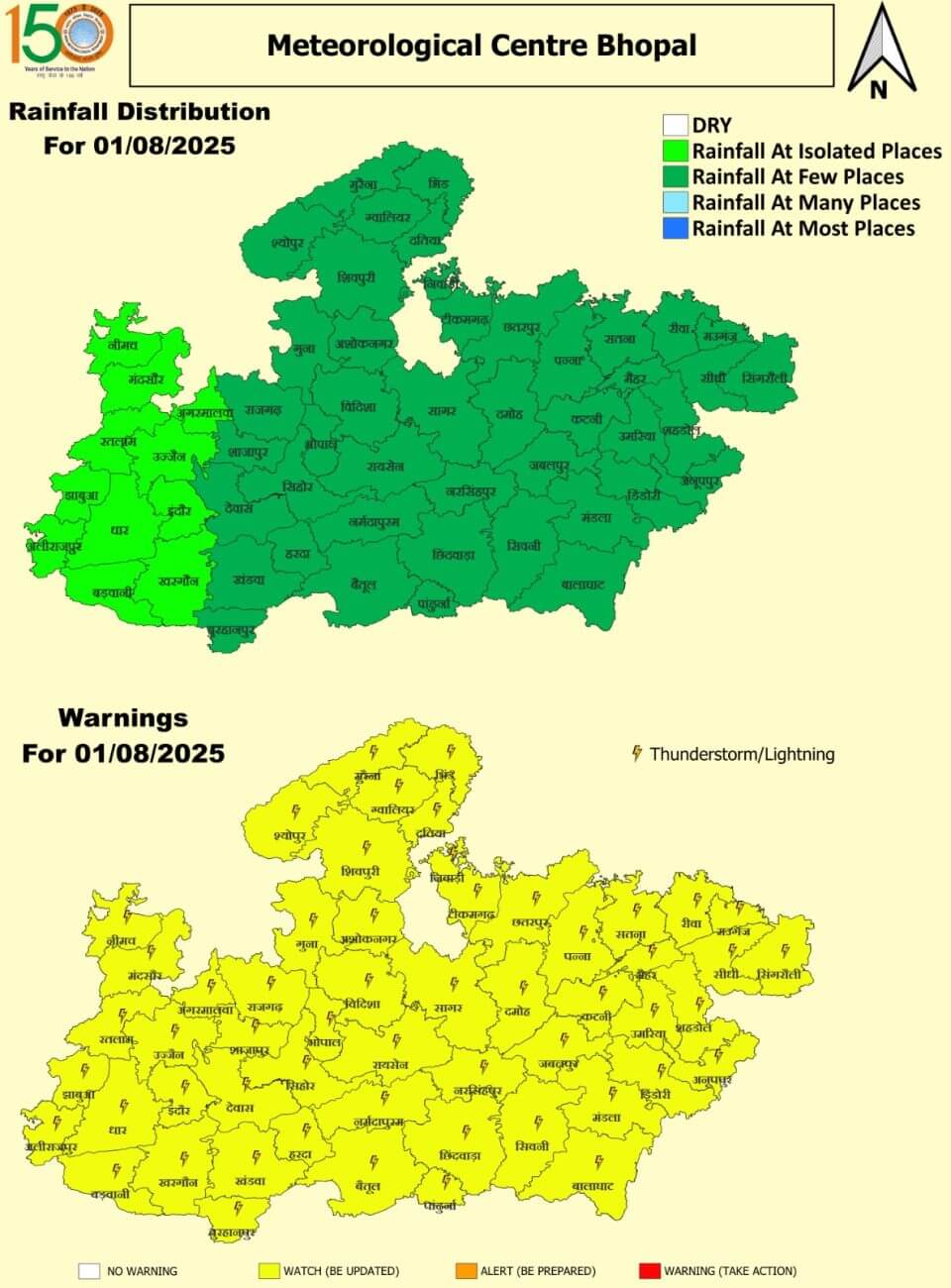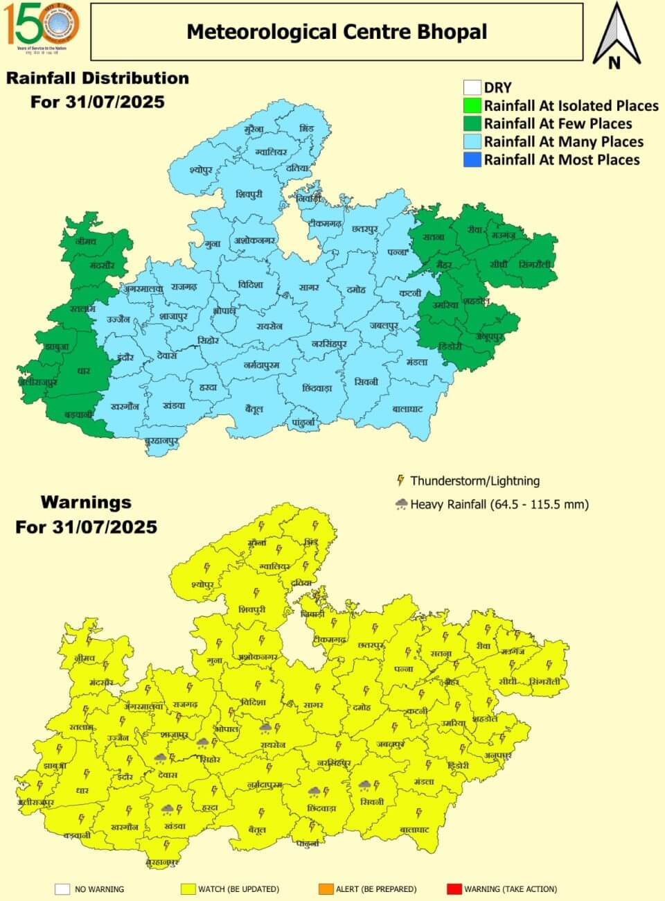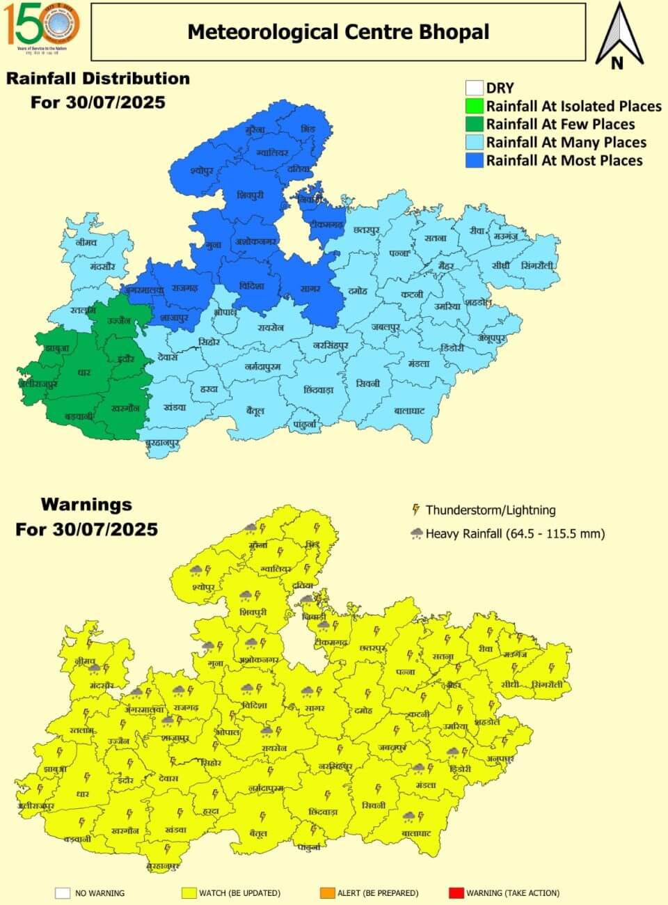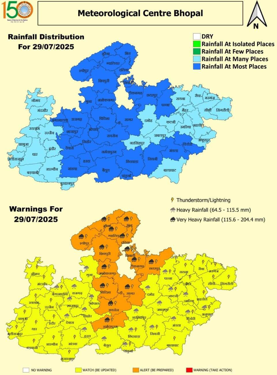 - ग्वालियर, शिवपुरी, गुना, अशोकनगर, भिंड, मुरैना, श्योपुर, भोपाल, रायसेन, राजगढ़, सीहोर, विदिशा, जबलपुर, नर्मदापुरम, सागर, टीकमगढ़ में भारी से अति भारी बारिश का अलर्ट।