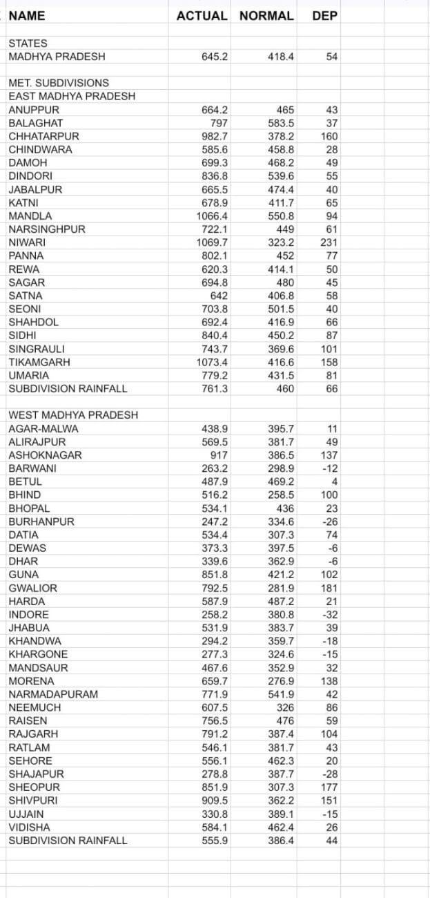 प्रदेश में 1 जून से 28 जुलाई तक औसत से 54% अधिक हुई है। इसमें पूर्वी मध्य प्रदेश में औसत से 66% अधिक और पश्चिमी मध्य प्रदेश औसत से 44% अधिक वर्षा दर्ज की गई है।अबतक ग्वालियर, शिवपुरी, अशोकनगर, मुरैना, श्योपुर, छतरपुर, टीकमगढ़ और निवाड़ी में बारिश का कोटा पूरा हो गया है। यहां सामान्य से 37% तक ज्यादा वर्षा हुई है हालांकि टीकमगढ़-निवाड़ी में सबसे ज्यादा 42 इंच वर्षा हुई है। इंदौर, उज्जैन, शाजापुर, भोपाल, बुरहानपुर, जबलपुर और आगर-मालवा अभी भी कम पानी गिरा है। इंदौर और उज्जैन संभाग में 12 से 32% तक ही वर्षा हुई है।