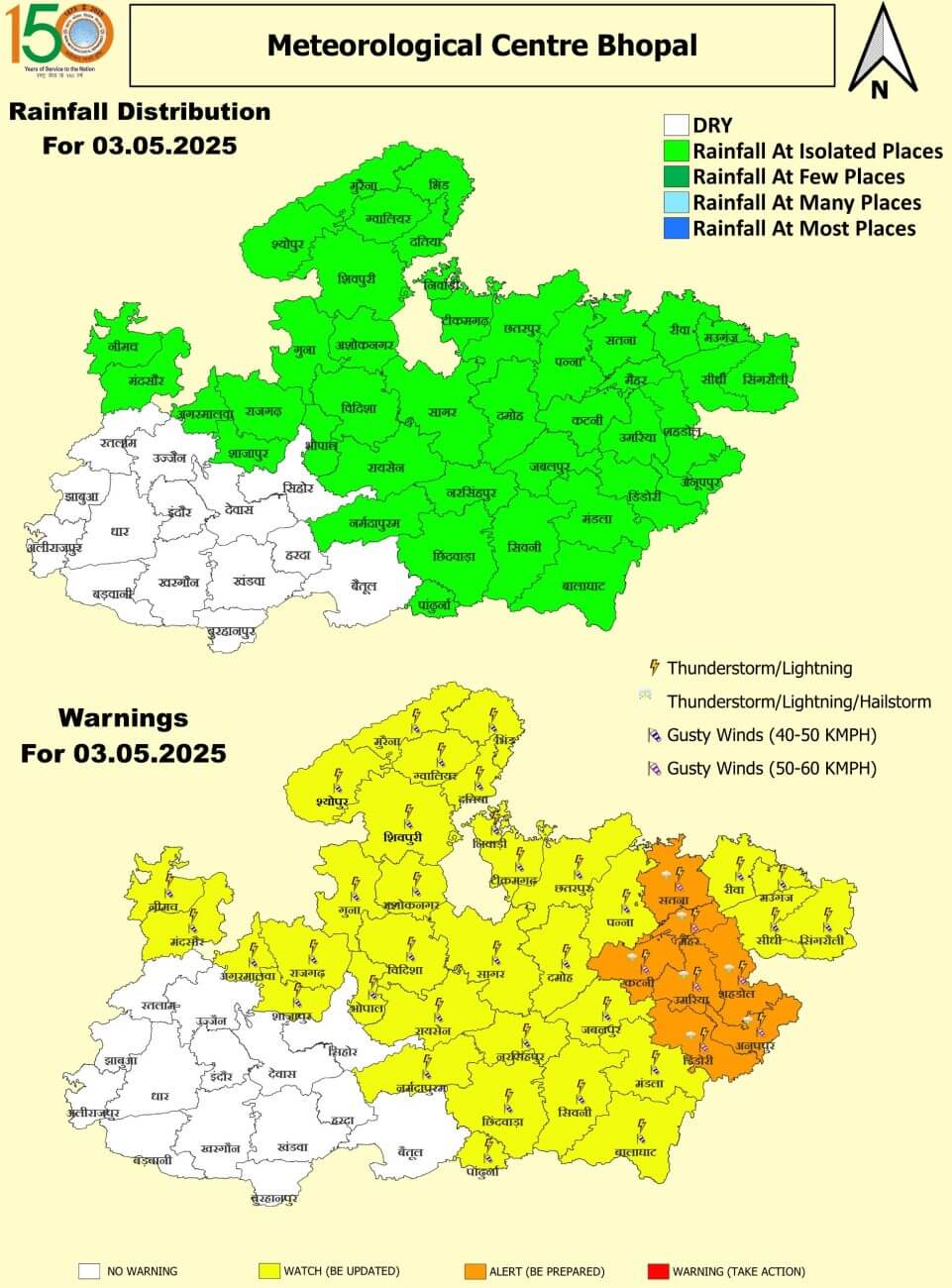 - 5 मई: भोपाल, ग्वालियर, जबलपुर, श्योपुर, मुरैना, भिंड, दतिया, शिवपुरी, गुना, अशोकनगर, विदिशा, रायसेन, नर्मदापुरम, बैतूल, सीहोर, हरदा, खंडवा, बुरहानपुर, खरगोन, बड़वानी, अलीराजपुर, नीमच, मंदसौर, रतलाम, आगर-मालवा, राजगढ़, शाजापुर, देवास, सागर, नरसिंहपुर, छिंदवाड़ा, पांढुर्णा, बालाघाट, मंडला, सिवनी, कटनी, दमोह, पन्ना, छतरपुर, टीकमगढ़, निवाड़ी, सतना, रीवा, मऊगंज, सीधी, सिंगरौली में बारिश ।