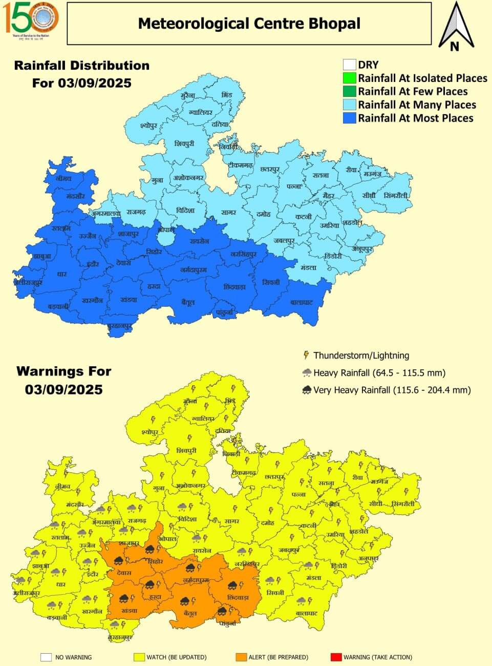 - इंदौर, उज्जैन, रतलाम, झाबुआ, अलीराजपुर, धार, बड़वानी, खरगोन, बुरहानपुर, आगर-मालवा, राजगढ़, शाजापुर, विदिशा, रायसेन, नरसिंहपुर, सिवनी, मंडला और बालाघाट में भारी बारिश।