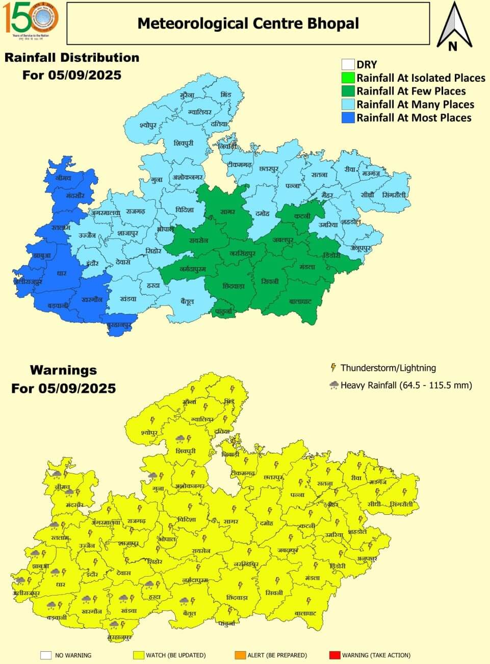 5 सितंबर : बड़वानी, अलीराजपुर, झाबुआ में अति भारी वर्षा, झंझावत वज्रपात कहीं-कहीं। बुरहानपुर, रतलाम, मंदसौर, डिंडोरी, मंडला, बालाघाट, खरगौन, धार में भारी वर्षा, झंझावत वज्रपात। भोपाल, विदिशा, रायसेन, सिहोर, राजगढ़, नर्मदापुरम, बैतूल, हरदा, खंडवा, इंदौर, उज्जैन, देवास, शाजापुर, आगर, नीमच,गुना, अशोकनगर, शिवपुरी, ग्वालियर, दतिया, भिंड, मुरैना, श्योपुरकलां, सिंगरौली, सीधी, रीवा, मऊगंज, सतना, अनुपपुर, शहडोल, उमरिया, कटनी, जबलपुर, नरसिंहपुर, छिंदवाड़ा, सिवनी, पन्ना, दमोह, सागर, छतरपुर, टीकमगढ़, निवाड़ी, मैहर, पांढुर्णा में झंझावत व वज्रपात कहीं कहीं।
