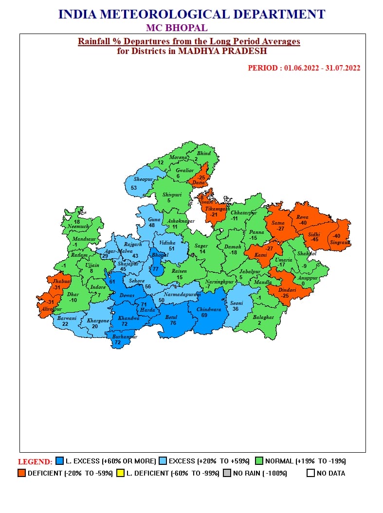 मौसम विभाग (MP Weather Rain Forecast) के अनुसार, वर्तमान में मानसून ट्रफ फिराेजपुर, राेहतक, मेरठ, गाेरखपुर, मुजफ्फरपुर, अगरतला हाेते हुए बांग्लादेश तक जा रहा है। हालांकि मध्य प्रदेश काे प्रभावित करने वाला कोई वेदर सिस्टम एक्टिव नहीं है लेकिन तराई में गई मानसून ट्रफ के दाे अगस्त के बाद फिर सामान्य स्थिति में आने की संभावना है। दाे अगस्त के आसपास उत्तर प्रदेश पर हवा के ऊपरी भाग में भी एक चक्रवात बनने के संकेत मिले हैं, इससे फिर बारिश का दौर शुरू हो सकता है।