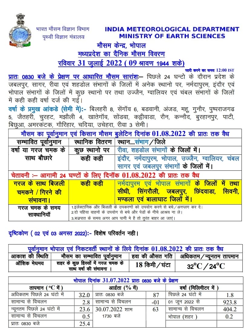 एमपी मौसम विभाग (MP Weather alert ) के अनुसार, आज रविवार 31 जुलाई सभी संभागों में कहीं कहीं या अनके स्थानों पर गरज चमक के साथ बारिश की संभावना है। रीवा और शहडोल संभागों में अनेक स्थानों पर, इंदौर, भोपाल, नर्मदापुरम, उज्जैन, ग्वालियर, चंबल जबलपुर और सागर संभागों में कुछ स्थानों पर गरज चमक के साथ बारिश की चेतावनी दी गई है। इसके अलावा भोपाल और नर्मदापुरम संभागों के साथ सीधी, सिंगरौली, जबलपुर, छिंदवाड़ा, सिवनी, मंडला और बालाघाट में बिजली गिरने और चमकने के लिए येलो अलर्ट जारी किया गया है।