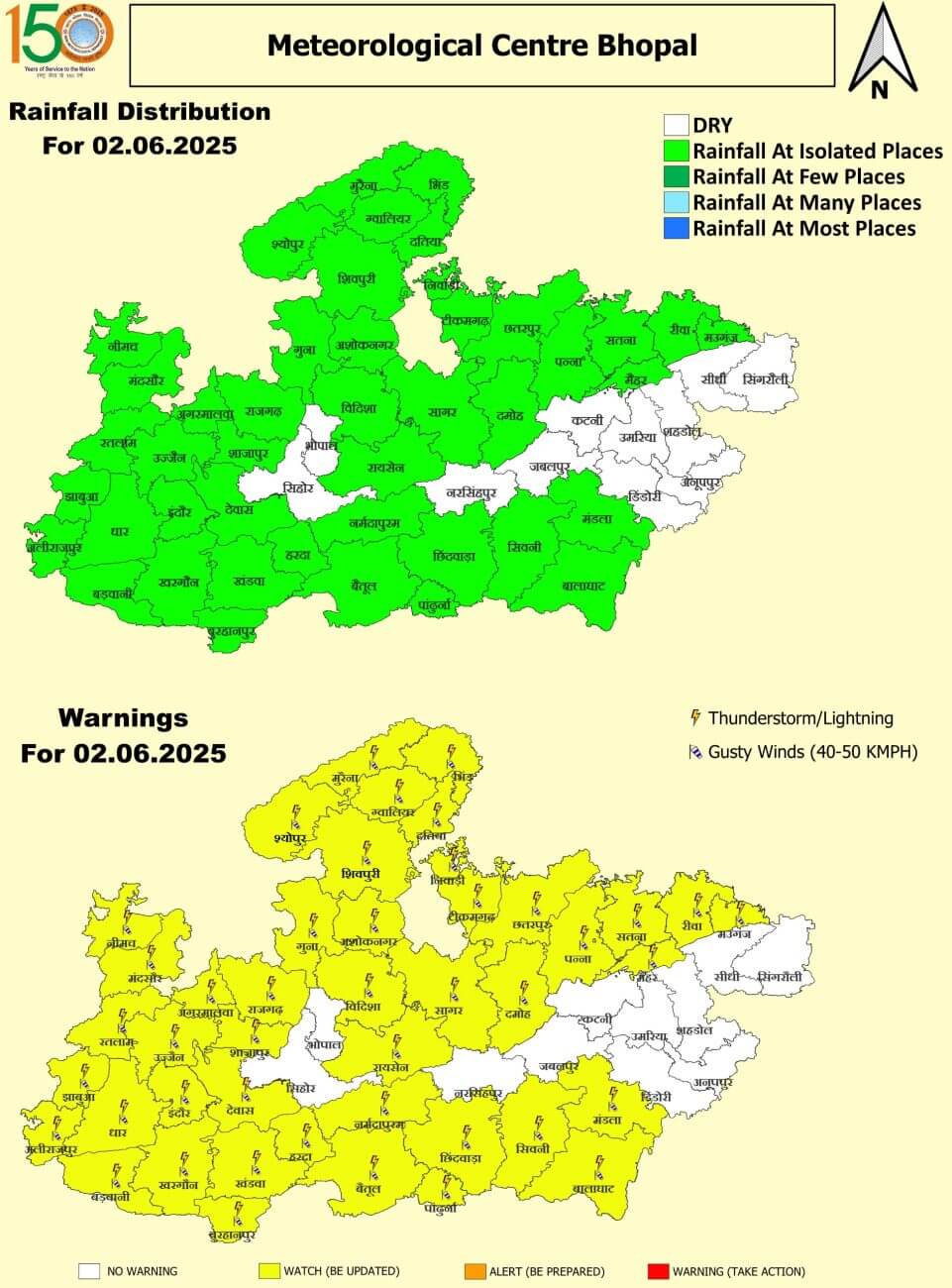2 जून सोमवार: इंदौर, उज्जैन, ग्वालियर, मुरैना, भिंड, दतिया, निवाड़ी, टीकमगढ़, छतरपुर, रीवा, पन्ना, दमोह, मंडला, बालाघाट, सिवनी, पांढुर्णा, छिंदवाड़ा, सागर, विदिशा, रायसेन, नर्मदापुरम, बैतूल, हरदा, शाजापुर, देवास, खंडवा, बुरहानपुर, खरगोन, बड़वानी, धार, अलीराजपुर, झाबुआ, रतलाम, मंदसौर, श्योपुर, शिवपुरी, अशोकनगर, गुना, राजगढ़, आगर-मालवा, सतना और नीमच में बारिश/हवा की रफ्तार 40 से 50 किलोमीटर प्रतिघंटा तक ।