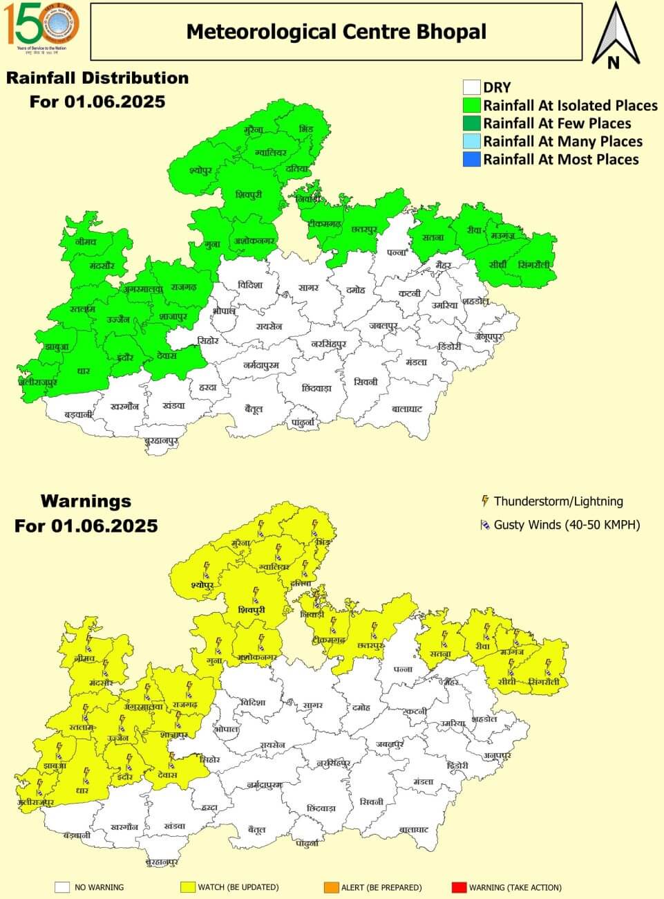 1 जून रविवार: इंदौर, उज्जैन, ग्वालियर, निवाड़ी, टीकमगढ़, छतरपुर, सतना, रीवा, मऊगंज, सीधी, सिंगरौली, दतिया, भिंड, मुरैना, श्योपुर, शिवपुरी, गुना, अशोकनगर, राजगढ़, शाजापुर, देवास, आगर-मालवा, नीमच, मंदसौर, रतलाम, झाबुआ, धार और अलीराजपुर में तेज आंधी/बारिश ।आंधी की रफ्तार 40 से 50 किलोमीटर प्रतिघंटा तक