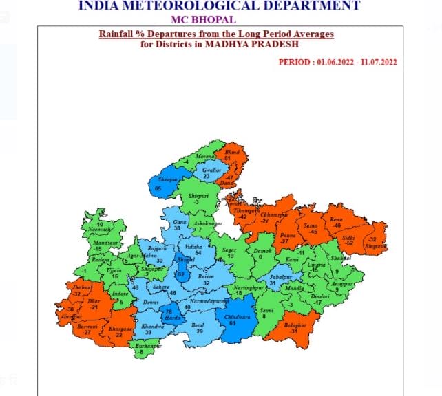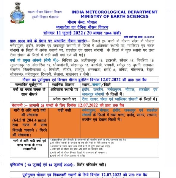 एमपी मौसम विभाग (MP Weather alert ) के अनुसार, आज सोवार 11 जुलाई 2022 को भोपाल, उज्जैन,इंदौर, शबडोल, जबलपुर और नर्मदापुरम संभाग के साथ पन्ना, दमोह, सागर, रतालम, उज्जैन और देवास जिले में भारी से अति भारी बारिश के लिए ऑरेंज अलर्ट जारी किया गया है। वही इन संभागों और जिलों में गरज चमक के साथ बिजली गिरने और चमकने की चेतावनी भी जारी की गई है। ग्वालियर में 13 जुलाई को भी गरज-चमक के साथ मध्यम वर्षा और बिजली चमकने के आसार है।