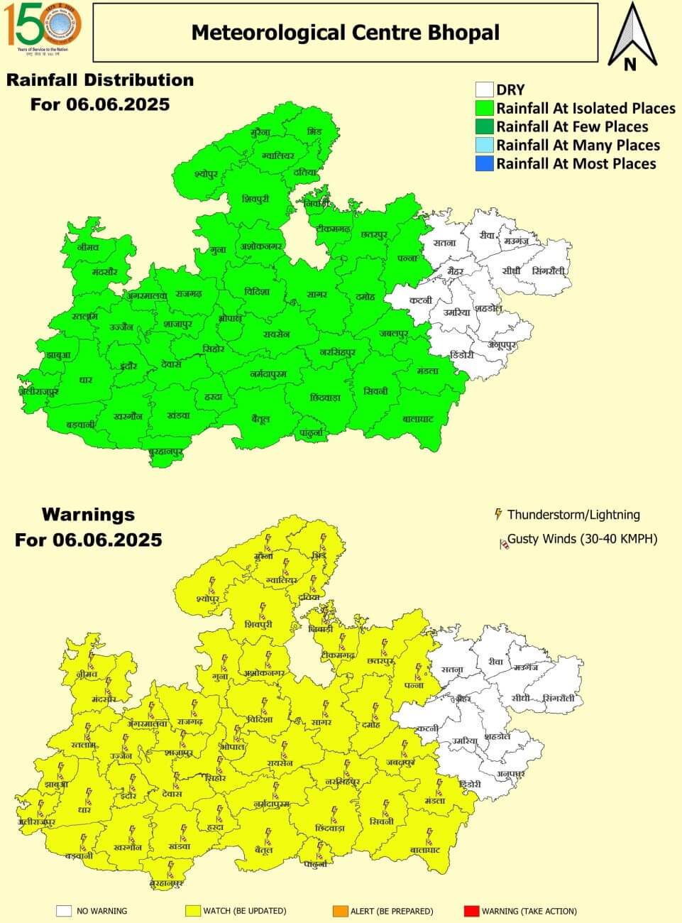 - 6 जून शुक्रवार : भोपाल, इंदौर, ग्वालियर, उज्जैन, जबलपुर श्योपुर, मुरैना, भिंड, दतिया, शिवपुरी, गुना, अशोकनगर, विदिशा, रायसेन, नर्मदापुरम, बैतूल, हरदा, सीहोर, राजगढ़, शाजापुर, देवास, खंडवा, बुरहानपुर, खरगोन, आगर-मालवा, नीमच, मंदसौर, रतलाम, झाबुआ, अलीराजपुर, बड़वानी, धार, निवाड़ी, टीकमगढ़, छतरपुर, पन्ना, सागर, दमोह, नरसिंहपुर, सिवनी, मंडला, बालाघाट, छिंदवाड़ा और पांढुर्णा में आंधी-बारिश का अलर्ट।
