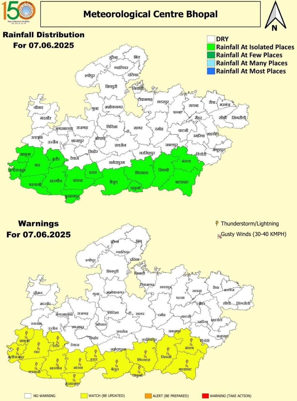 - 7 जून शनिवार : मंडला, बालाघाट, सिवनी, छिंदवाड़ा, पांढुर्णा, बैतूल, हरदा, खंडवा, बुरहानपुर, खंडवा, इंदौर, धार, बड़वानी, झाबुआ और अलीराजपुर में तेज आंधी/हल्की बारिश।
