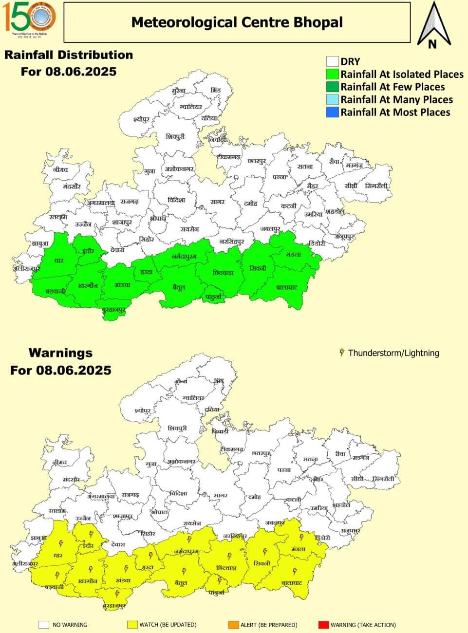 - 8 जून रविवार : इंदौर, मंडला, बालाघाट, सिवनी, छिंदवाड़ा, पांढुर्णा, बैतूल, हरदा, खंडवा, बुरहानपुर, खंडवा, धार, बड़वानी में तेज आंधी/हल्की बारिश ।