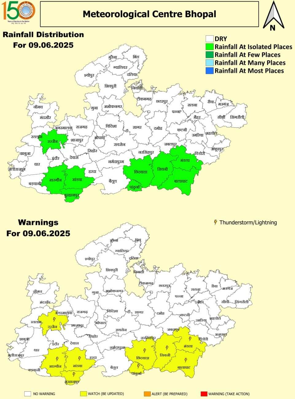 - 9 जून सोमवार : उज्जैन, मंडला, बालाघाट, सिवनी, छिंदवाड़ा, पांढुर्णा, खरगोन, खंडवा, बुरहानपुर में तेज आंधी/बारिश।