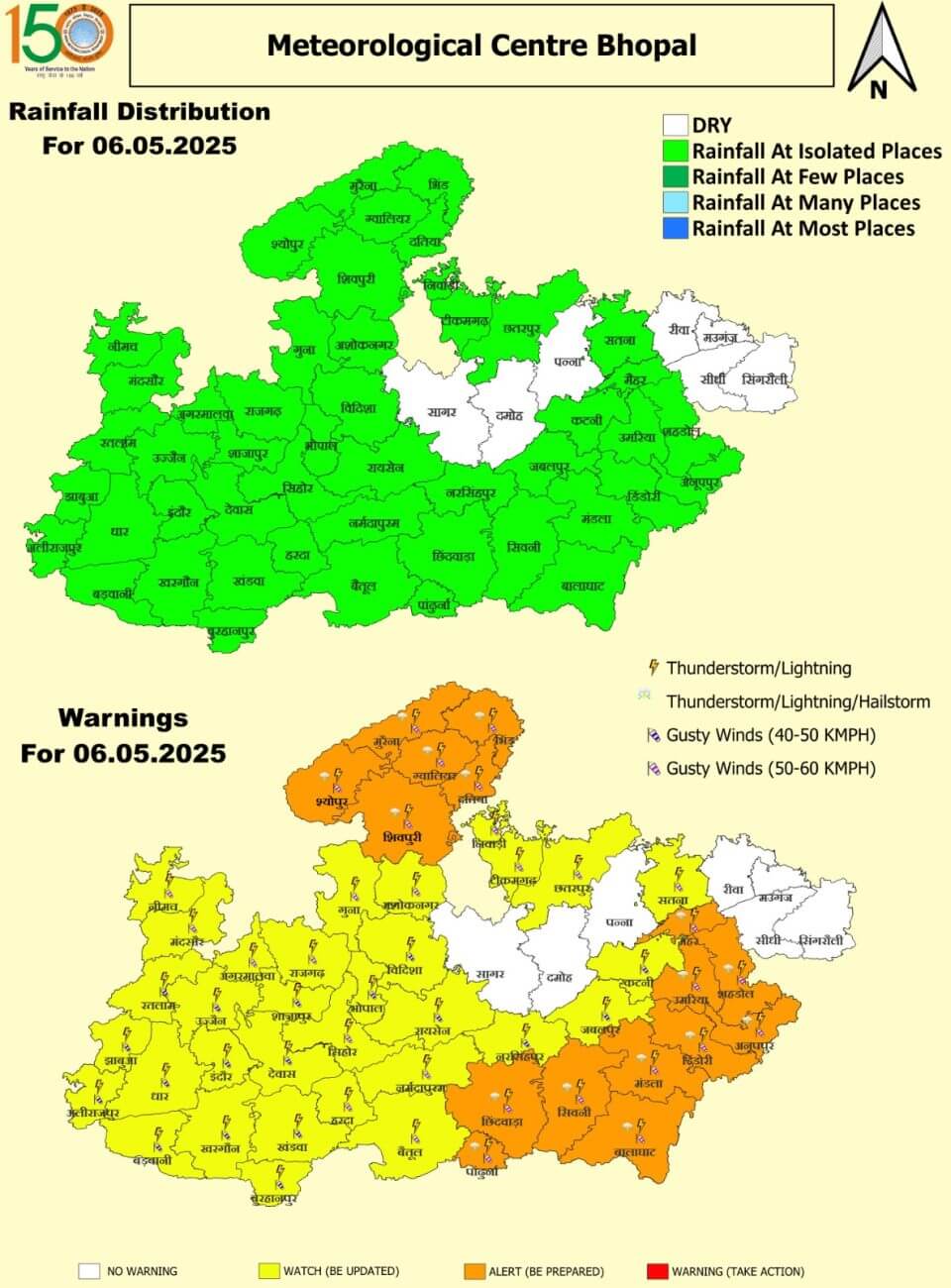 - 6 मई मंगलवार: ग्वालियर, श्योपुर, मुरैना, भिंड, दतिया, शिवपुरी,मैहर, उमरिया, शहडोल, अनूपपुर, डिंडौरी, मंडला, बालाघाट, सिवनी, छिंदवाड़ा, पांढुर्णा में ओलावृष्टि ।इंदौर, भोपाल, उज्जैन, जबलपुर, नीमच, मंदसौर, रतलाम, आगर-मालवा, शाजापुर, झाबुआ, अलीराजपुर, धार, बड़वानी, खरगोन, बुरहानपुर, देवास, गुना, अशोकनगर, राजगढ़, , विदिशा, रायसेन, सीहोर, नर्मदापुरम, बैतूल, नरसिंहपुर, कटनी, सतना, निवाड़ी, टीकमगढ़, छतरपुर में गरज-चमक, बारिश और आंधी ।