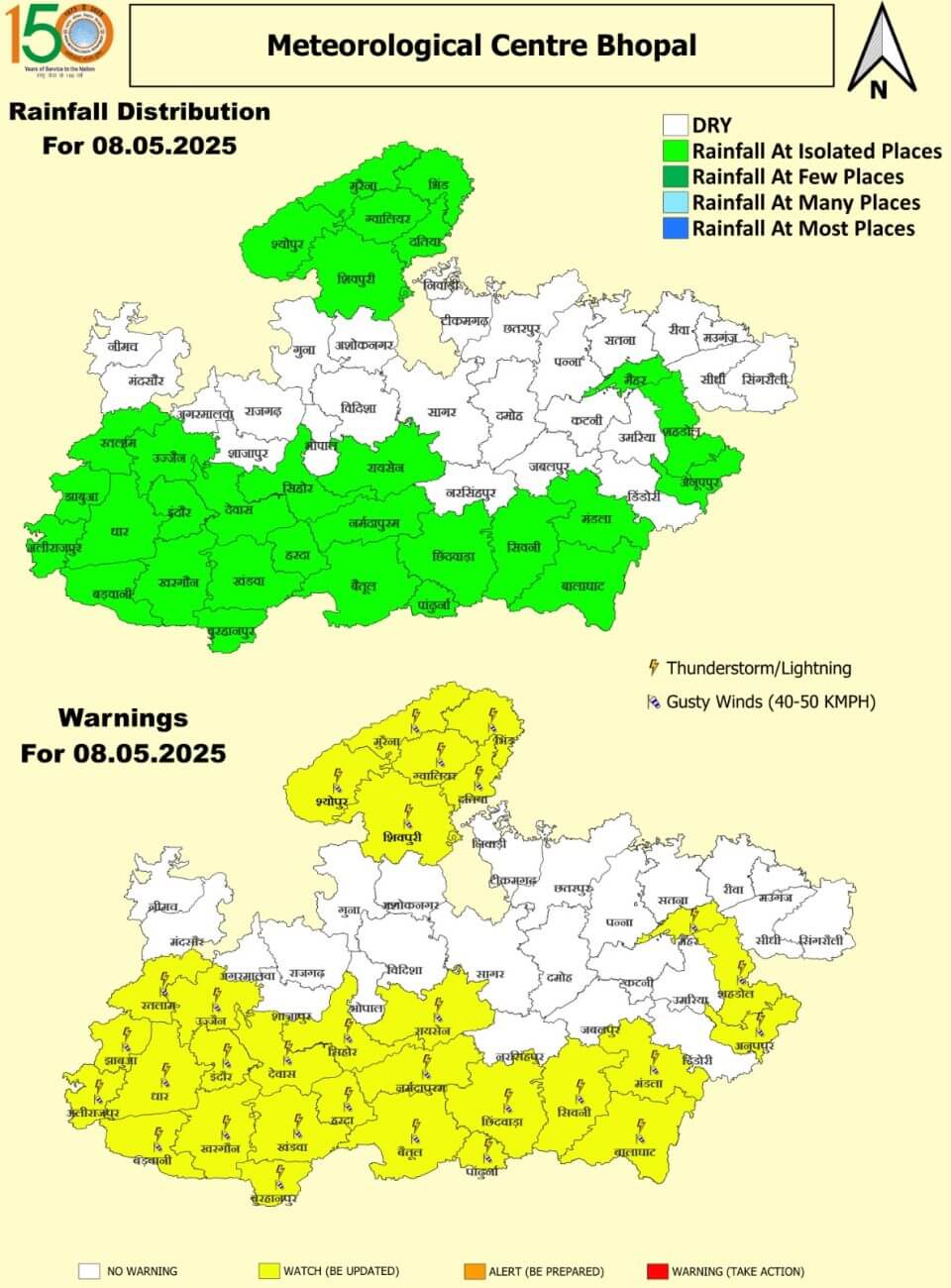 - 8 मई गुरूवार: ग्वालियर, श्योपुर, मुरैना, भिंड, दतिया, शिवपुरी, मैहर, शहडोल, अनूपपुर, मंडला, बालाघाट, सिवनी, छिंदवाड़ा, पांढुर्णा, बैतूल, नर्मदापुरम, रायसेन, सीहोर, हरदा, देवास, खंडवा, बुरहानपुर, खरगोन, रतलाम, झाबुआ, अलीराजपुर, बड़वानी में गरज-चमक के साथ बारिश ।