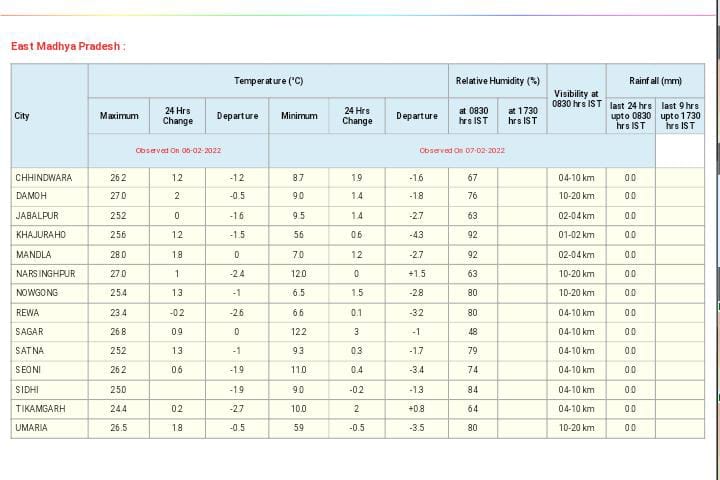भोपाल, डेस्क रिपोर्ट। मध्य प्रदेश में (MP Weather Update Today 7 February 2022) एक बार फिर मौसम में बड़ा बदलाव देखने को मिल सकता है। 8-9 फरवरी को नए वेदर सिस्टम बनने से बादल छाने और बारिश के आसार है। एमपी मौसम विभाग (MP Weather Department) ने आज 7 फरवरी 2022 को मौसम के शुष्क रहने की संभावना जताई है, लेकिन 14 किमी/घंटा की रफ्तार से हवा चल सकती है ।वही 9 फरवरी को बादल छा सकते हैं और ग्वालियर अंचल में बूंदाबांदी भी हो सकती है और पश्चिमी विक्षोभ के कारण पूर्वी मध्यप्रदेश में कहीं-कहीं हल्की बूंदाबांदी और बारिश भी होने की संभावना है।