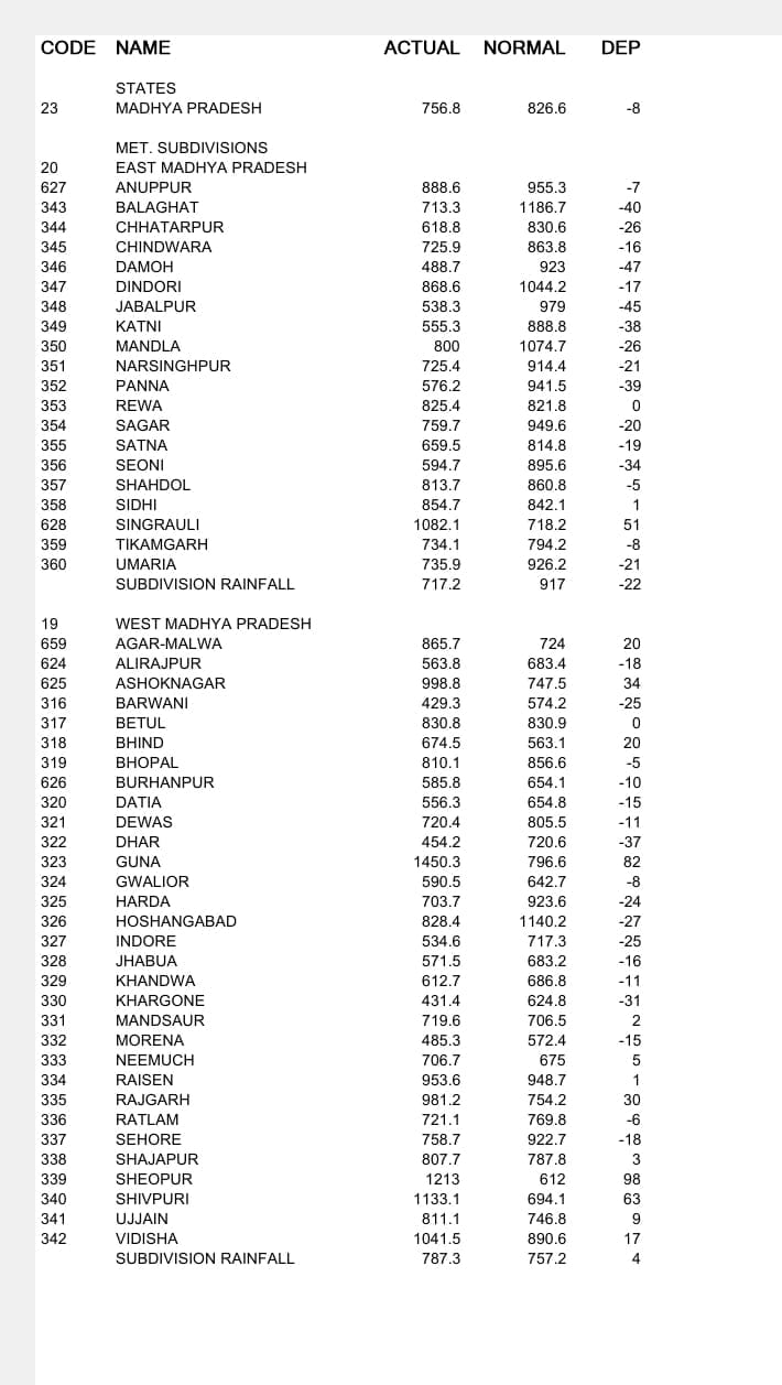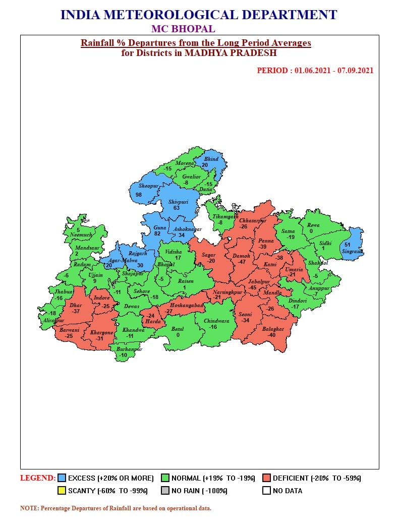 Madhya Pradesh – 1st June to 7th September 2021 – 8% below long period average (i.e. Normal rainfall). दीर्घावधि औसत से 8% कम (समान्य वर्षा)