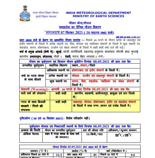 मौसम विभाग (MP Weather Alert) ने आज मंगलवार 7 सितंबर 2021 को सभी संभागों इंदौर, चंबल, जबलपुर होशंगाबाद, सागर, रीवा, ग्वालियर, भोपाल, उज्जैन और शहडोल में कहीं-कहीं गरज-चमक के साथ बारिश की संभावना है। खरगोन, अलीराजपुर, झाबुआ, धार और बड़वानी भारी बारिश के संभावना जताते हुए अलर्ट जारी किया है। इसके अलावा जबलपुर, भोपाल, होशंगबाद, शहडोल और इंदौर संभागों समेत पन्ना, सागर-दमोह जिलों में गरज के साथ बिजली चमकने और गिरने के लिए भी येलो अलर्ट जारी किया है।