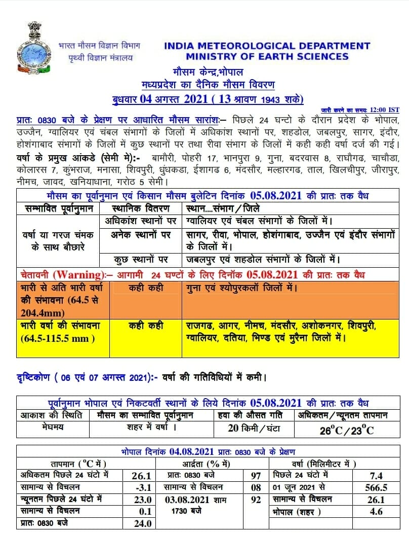 मौसम विभाग (MP Weather Alert) ने आज बुधवार 4 अगस्त 2021 शहडोल, जबलपुर, इंदौर, उज्जैन, होशंगाबाद, ग्वालियर-चंबल, भोपाल, सागर, रीवा संभाग के जिलों में कहीं कहीं बौछारें पड़ने की संभावना हैं। वही श्योपुरकलां और गुना में अति भारी बारिश (Heavy Rain) के साथ ऑरेंज अलर्ट (Orange alert) और राजगढ़,आगर, नीमच, मंदसौर, अशोकनगर, शिवपुरी, ग्वालियर,दतिया, भिंड और मुरैना में येलो अलर्ट (Yellow Alert) जारी किया गया है। वही बिजली चमकने और गिरने के साथ 20 प्रति घंटा की रफ्तार से हवा चलने के भी आसार है।