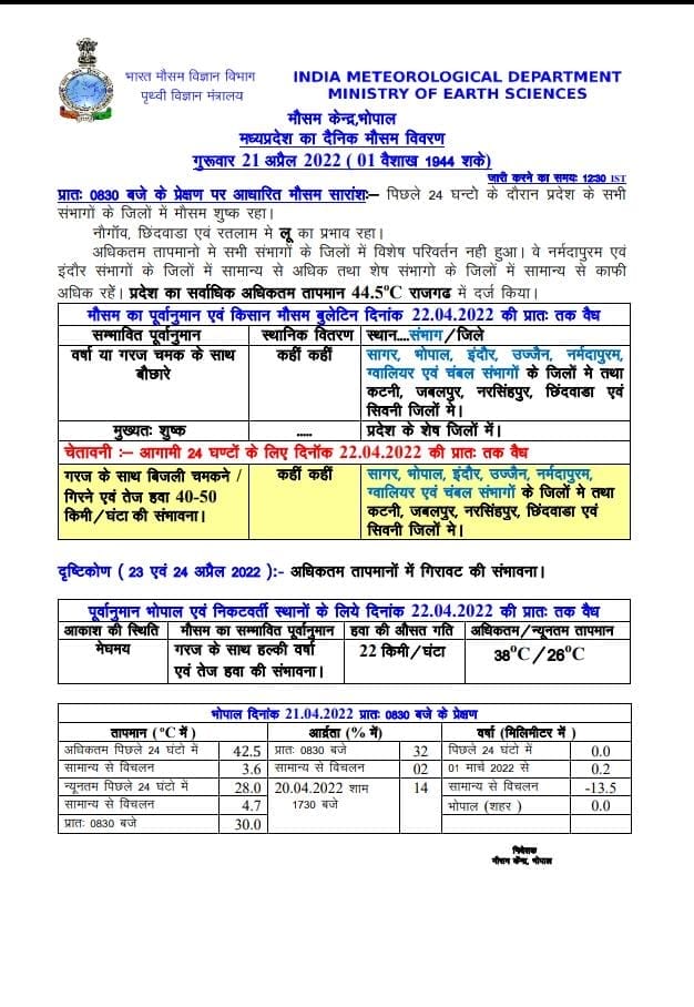 मौसम विभाग (MP Weather Department) की माने तो छिंदवाड़ा, रतलाम में लू का प्रभाव देखने को मिला है। इसे 24 घंटे में प्रदेश के सभी संभागों में मौसम शुष्क रहे हैं। अधिकतम तापमान में सभी संभाग के जिले में कुछ विशेष परिवर्तन देखने को नहीं मिला। इंदौर, नर्मदा पुरम संभाग में सामान्य से अधिक और से संभागों में सामान्य से काफी अधिक तापमान रिकॉर्ड किया गया है।मौसम विभाग की मानें तो प्रदेश में सर्वाधिक अधिक तापमान 44.5 डिग्री सेल्सियस राजगढ़ में रिकॉर्ड किया गया।