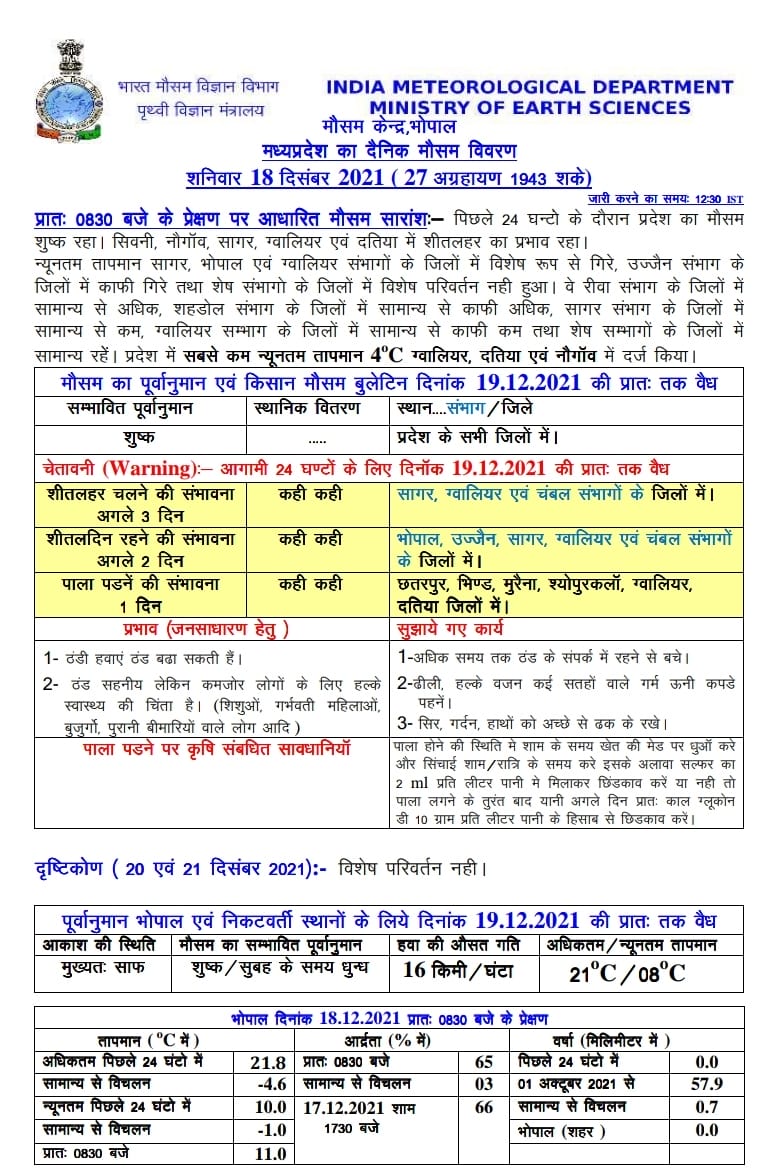 एमपी मौसम विभाग (MP Weather Department) ने आज 18 दिसंबर 2021 को सागर, ग्वालियर-चंबल में अगले तीन दिन तक और भोपाल, उज्जैन, सागर, ग्वालियर-चंबल में अगले 2 दिनों तक शीतलहर की संभावना जताई है।वही छतरपुर, भिंड, मुरैना, श्योपुर, ग्वालियर और दतिया में एक दिन पाला पड़ने की संभावना है।उत्तर में बर्फबारी के कारण प्रदेश में कई जगह पर रात का पारा 8 डिग्री तक नीचे आ गया है।चार से पांच दिनों तक तेज ठंड पड़ सकती है।