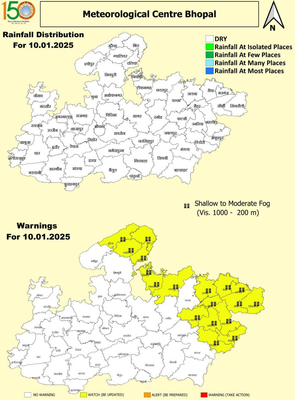 - ग्वालियर, दतिया, भिंड, मुरैना, सिंगरौली, सीधी, रीवा, मऊगंज, सतना, अनूपपुर, शहडोल, उमरिया, डिंडोरी, कटनी, छतरपुर, टीकमगढ़, निवाड़ी और मैहर जिलों में कोहरा छाया।