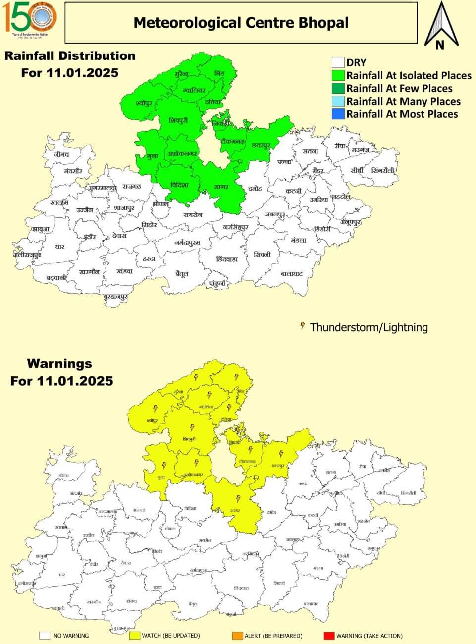 एमपी मौसम विभाग की मानें तो 11 जनवरी को विदिशा, गुना, अशोकनगर, शिवपुरी, ग्वालियर, दतिया, भिंड, मुरैना, श्योपुर, सागर, छतरपुर, टीकमगढ़, निवाड़ी में बादल , बूंदाबांदी और कोहरा भी रहेगा।12 जनवरी को विदिशा, बैतूल, ग्वालियर, दतिया, भिंड, सिंगरौली, सीधी, रीवा, मऊगंज, सतना, कटनी, नरसिंहपुर, पन्ना, दमोह, सागर में बूंदाबांदी होने की संभावना है।