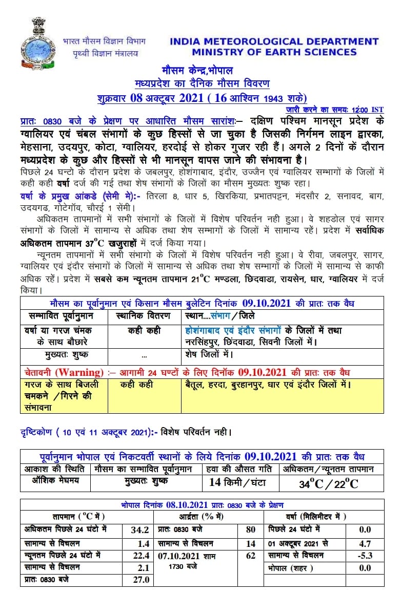 भोपाल, डेस्क रिपोर्ट। अक्टूबर का दूसरा हफ्ता लगते ही मध्यप्रदेश (MP Weather Today) के मौसम में बदलाव देखने को मिल रहा है। वातावरण में धीरे धीरे नमी कम हो रही है और दिन-रात के तापमान में भी परिवर्तन हो रहा है। मौसम विभाग (MP Weather Department) की मानें तो एक हफ्ते के अंदर मानसून की विदाई हो सकती है, इसकी शुरुआत ग्वालियर-चंबल से हो चुकी है। वही आज शुक्रवार 8 अक्टूबर 2021 को 14 जिलों में कही कही बारिश की संभावना है और 5 जिलों में बिजली गिरने और चमकने के चलते येलो अलर्ट जारी किया गया है।