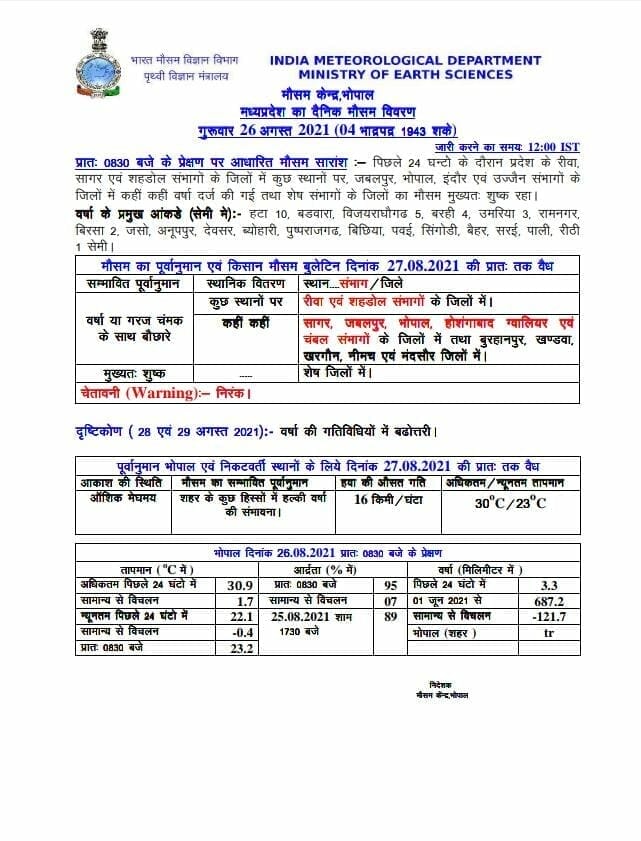 मौसम विभाग (weather department) के अनुसार पिछले 24 घंटे में कई जिलों में बारिश रिकॉर्ड की गई है। जिससे प्रदेश के रीवा, सागर और शहडोल संभाग के कुछ इलाकों में जबलपुर, भोपाल, इंदौर, उज्जैन संभाग में कहीं-कहीं बारिश हुई है। विभाग की माने तो हटा में 10 सेंटीमीटर, विजय राघौगढ़ , बरही 4, उमरिया 3, रामनगर, अनूपपुर, देवसर, पुष्पराजगढ़ में 1 सेंटीमीटर बारिश रिकॉर्ड की गई है।
