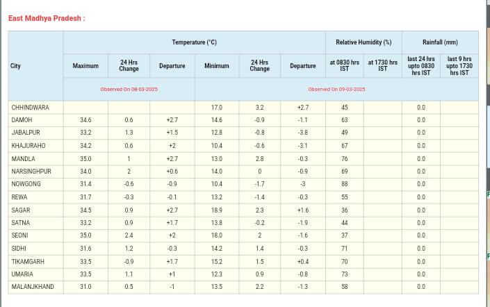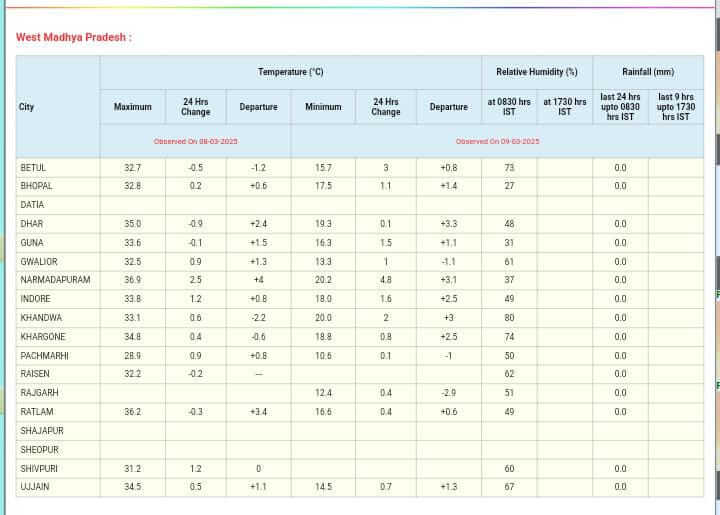 - सर्वाधिक तापमान 36.9 डिग्री सेल्सियस नर्मदापुरम जिले में दर्ज हुआ।
