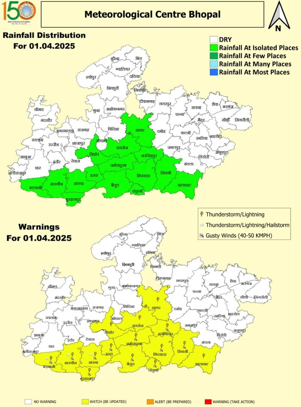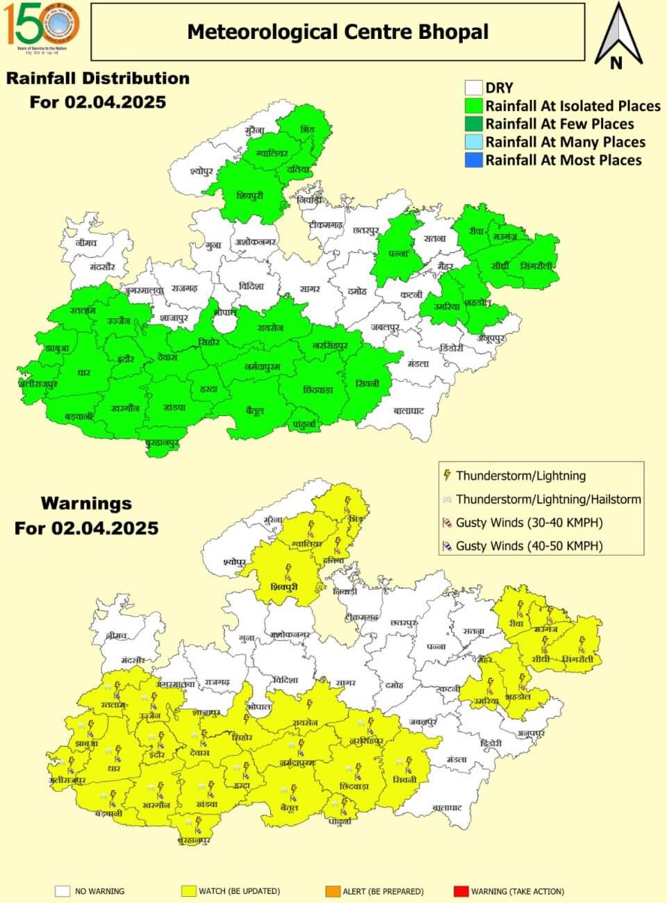 - 2 अप्रैल बुधवार: नर्मदापुरम, बैतूल, बुरहानपुर, खंडवा, खरगोन, बड़वानी, धार, अनूपपुर, डिंडोरी और बालाघाट में ओले गिरने का अलर्ट । हरदा-शिवपुरी समेत विदिशा, रायसेन, सीहोर, राजगढ़, अलीराजपुर, झाबुआ, इंदौर, रतलाम, उज्जैन, देवास, शाजापुर, आगर-मालवा, मंदसौर, नीमच, ग्वालियर, दतिया, भिंड, श्योपुर, सिंगरौली, सीधी, शहडोल, नरसिंहपुर, छिंदवाड़ा, सिवनी, मंडला, सागर और पांढुर्णा में तेज आंधी।