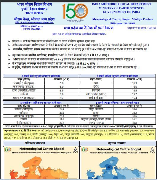 MP Weather Update Today : मार्च से पहले फरवरी अंत में एक फिर मध्य प्रदेश के मौसम में बदलाव देखने को मिलेगा। पश्चिमी विक्षोभ के आगे बढ़ने से तापमान में हल्की गिरावट आने का अनुमान है, इससे पहले 2 दिन तापमान में 2 से 3 डिग्री की वृद्धि होने का अनुमान है।हालांकि रात और सुबह के समय ठंडक बनी रहेगी।