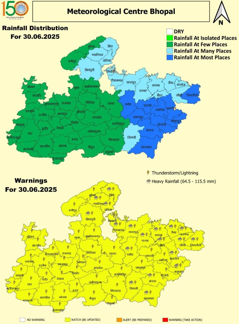सोमवार 30 जून: ग्वालियर, भिंड, दतिया, शिवपुरी, टीकमगढ़, छतरपुर, दमोह, सतना, पन्ना, रीवा, मऊगंज, सीधी, सिंगरौली, शहडोल, अनूपपुर, मंडला, सिवनी और बालाघाट में भारी बारिश का अलर्ट । भोपाल, जबलपुर, इंदौर-उज्जैन समेत अन्य जिलों में हल्की से मध्यम बारिश का यलो अलर्ट ।