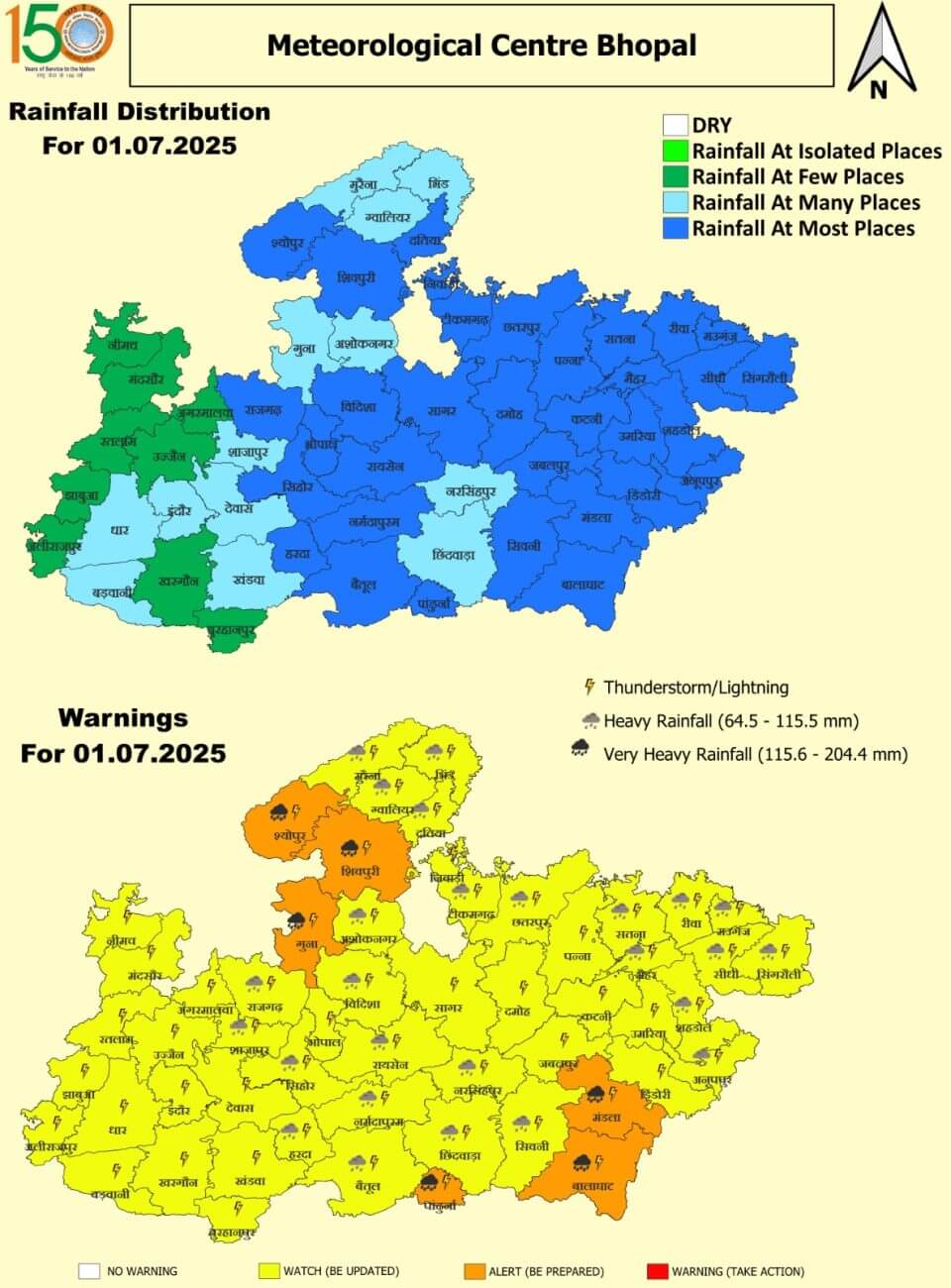 - 1 जुलाई को 6 जिलों (श्योपुर, शिवपुरी, गुना, मांडला, बालाघाट, पांढुर्णा ) में अति भारी बारिश का ऑरेंज अलर्ट।26 जिलों में भारी बारिश ।