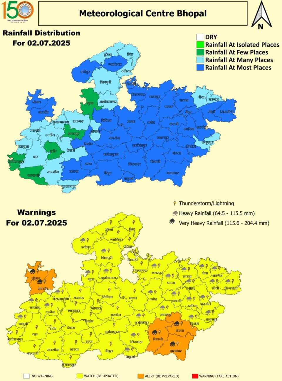 - 2 जुलाई को 5 जिलों में (नीमच, मंदसौर, सिवनी, बालाघाट, मंडला) में भारी बारिश का ऑरेंज अलर्ट। 27 जिलों में भारी बारिश ।