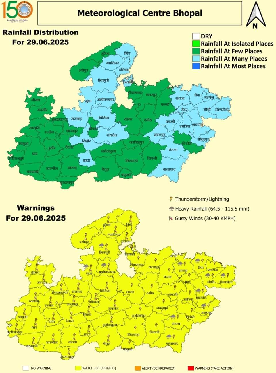 रविवार 29 जूनः गुना, अशोकनगर, शिवपुरी, सतना, रीवा, सीधी, सिंगरौली, शहडोल, अनूपपुर, मंडला और बालाघाट में भारी बारिश का अलर्ट ।भोपाल, इंदौर, उज्जैन, ग्वालियर, जबलपुर समेत अन्य जिलों में हल्की से मध्यम बारिश का यलो अलर्ट।