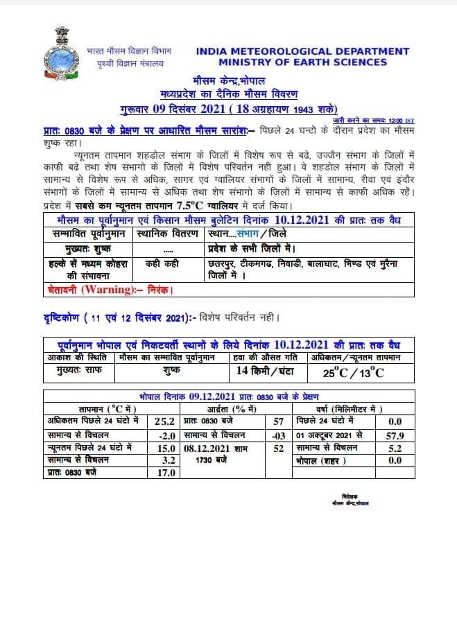 इसके अलावा शहडोल संभाग के जिलों में सामान्य से विशेष रूप से अधिक और ग्वालियर और सागर संभाग में न्यूनतम तापमान सामान्य से काफी अधिक रहे हैं। प्रदेश में सबसे कम न्यूनतम तापमान 7.5 डिग्री सेल्सियस ग्वालियर में दर्ज किया गया है। ग्वालियर में पारा 0.5 डिग्री की गिरावट के साथ 7.5 डिग्री पर पहुंच गया है। इसके अलावा भोपाल में भी तापमान में 0.6 डिग्री की कमी देखी गई है।