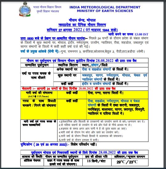 भोपाल, डेस्क रिपोर्ट। मध्य प्रदेश का मौसम एक बार फिर बदलने वाला है। एक बार फिर नए चक्रवात के बनने से प्रदेश के कई जिलों में झमाझम बारिश के संकेत है। रविवार को रीवा, पन्ना और सतना समेत बुंदेलखंड और बघेलखंड के कई जिलों में अच्छी बारिश के आसार हैं। एमपी मौसम विभाग (MP Weather Department) ने आज शनिवार 27 अगस्त 2022 को सभी संभागों में गरज चमक के साथ हल्की से मध्यम बारिश की चेतावनी जारी की है। वही 3 जिलों में भारी बारिश की चेतावनी के लिए येलो अलर्ट जारी किया गया है, वही 27 जिलों में बिजली गिरने की चेतावनी जारी की है।