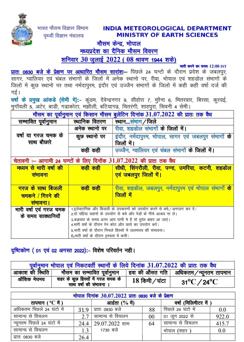 मौसम विभाग (MP Weather Rain Forecast) के अनुसार, भोपाल/बैरागढ़, रायसेन, विदिशा/उदयगिरी, सांची, सीहोर, शाजापुर, राजगढ़, नर्मदापुरम, सागर, गुना, आगर, सिवनी, बालाघाट, मंडला, सिंगरौली, सीधी, डिंडोरी, अनूपपुर/अमरकंटक, उमरिया, शहडोल, श्योपुर कलां और हरदा जिले में बिजली के साथ हल्की गरज के साथ छींटे पड़ने की संभावना है। 2 अगस्त को उत्तर प्रदेश में हवा के ऊपरी भाग में एक चक्रवात बनने की संभावना है, इसके प्रभाव से 3अगस्त से मानसून के फिर एक्टिव होने और बारिश की गतिविधियां में तेजी आने के आसार है।