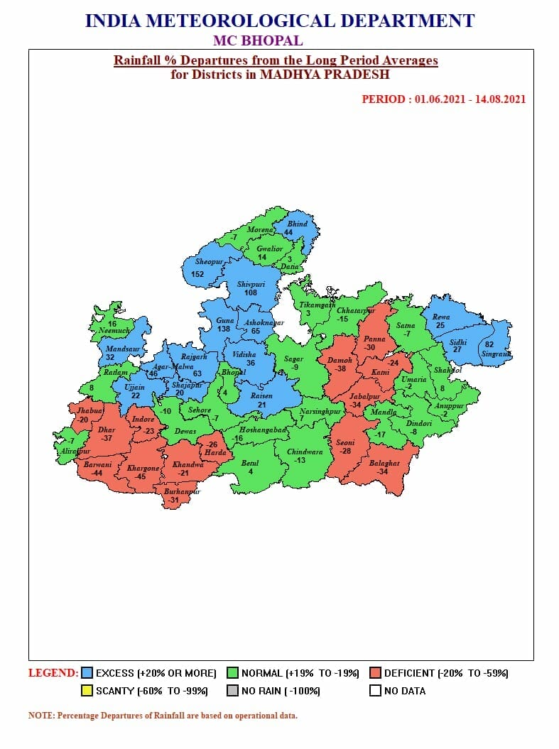 वही 13 जिले धार, खरगोन, बड़वानी, बुरहानपुर, इंदौर, खंडवा, हरदा, पन्ना, दमोह, कटनी, जबलपुर, सिवनी और बालाघाट में अब भी रेड जोन में हैं।इसके अलावा श्योपुर, शिवपुरी, गुना, अशोकनगर, विदिशा, रायसेन, राजगढ़, आगर-मालवा, शाजापुर, उज्जैन, मंदसौर, भिंड, रीवा, सीधी और सिंगरौली में सामान्य से अधिक बारिश हुई है।भोपाल-होशंगाबाद और सागर में अभी तक सामान्य बारिश हुई है, जिसके कारण यह इलाके ग्रीन जोन में हैं।