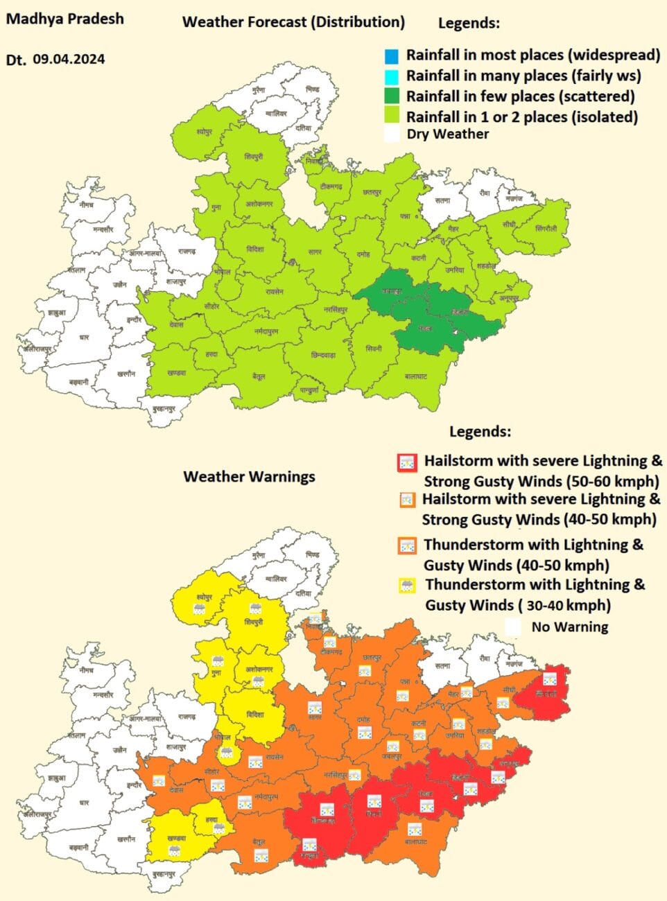 - रीवा, सीधी, सिंगरौली, अनूपपुर, डिंडोरी, छिंदवाड़ा, सिवनी, मंडला, बालाघाट, नरसिंहपुर, दमोह, कटनी, बैतूल, नर्मदापुरम, सीहोर, रायसेन, शाजापुर, भोपाल, राजगढ़, आगर-मालवा, नीमच , रतलाम, झाबुआ, अलीराजपुर, बड़वानी, धार, उज्जैन, देवास, इंदौर, हरदा, खंडवा और बुरहानपुर जिलों में बारिश, आंधी-तूफान की प्रबल संभावना ।