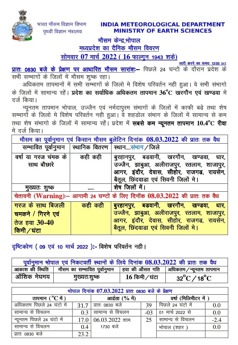 मौसम विभाग (MP Weather Report) के मुताबिक, आज 7 मार्च 2022 मालवा-निमाड़ समेत 19 जिलों में बारिश के आसार है। पिछले 24 घंटे में भी सभी संभाग के जिलों में मौसम शुष्क बना रहा। सबसे न्यूनतम तापमान 10.6 डिग्री सेल्सियस रीवा में दर्ज किया गया।वही सबसे अधिकतम तापमान खरगोन/ खंडवा में 36 डिग्री सेल्सियस दर्ज किया गया।एक नया पश्चिमी विक्षोभ भी सक्रिय हो रहा है, जिसके प्रभाव से सोमवार या मंगलवार को बादल छा सकते हैं। 7 मार्च को ग्वालियर चंबल और इंदौर संभाग में बादल छा सकते है और कहीं-कहीं गरज-चमक के साथ बूंदाबांदी भी हो सकती है।