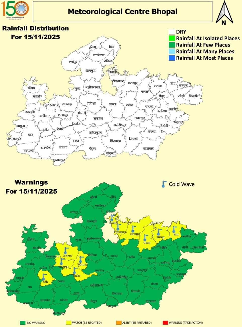 - देवास, सतना, उमरिया, जबलपुर, छिंदवाड़ा, सिवनी, छतरपुर, टीकमगढ़, मैहर,अनुपपुर, बालाघाट में शीतलहर की चेतावनी