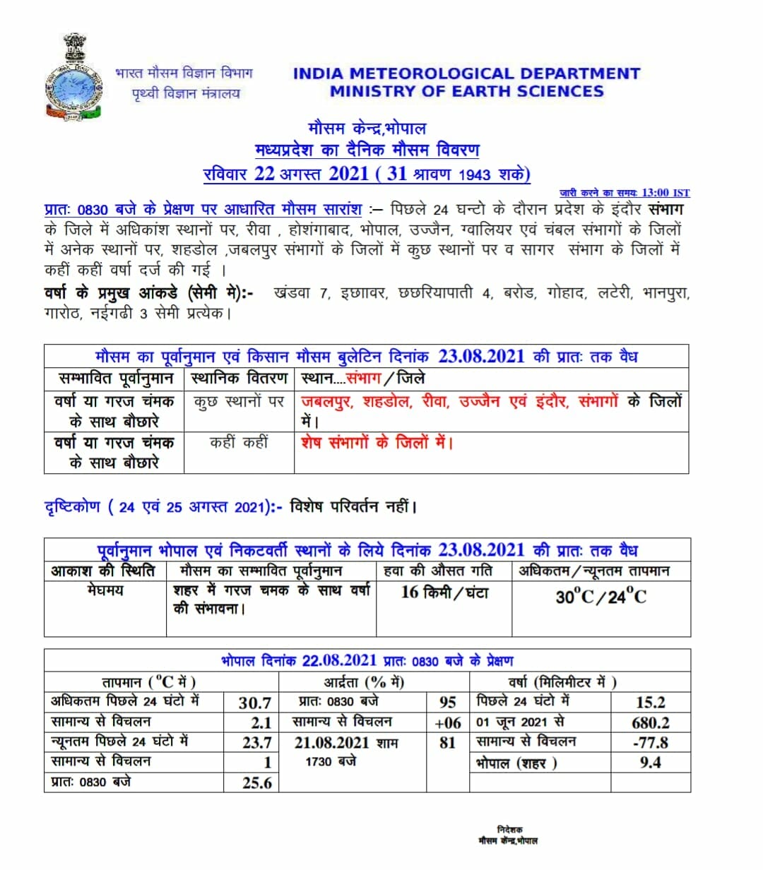 मौसम विभाग (MP Weather alert) ने आज रविवार को सभी संभागों उज्जैन, शहडोल, जबलपुर, इंदौर और रीवा में कहीं कहीं बारिश की संभावना जताई है। वही सभी संभागों में बिजली चमकने और गिरने के लिए भी बौछार के आसार है।अगले तीन दिन तक इंदौर में गरज-चमक के साथ हल्की बारिश हो सकती है।इंदौर में 30 अगस्त के बाद तेज बारिश का दौर दिखाई देगा। वर्तमान में पूर्वोत्तर राजस्थान, पश्चिमोत्तर मध्य प्रदेश के ऊपर चक्रवात सक्रिय है। मानसून ट्रफ बीकानेर, सवाई माधोपुर, टीकमगढ़, सीधी, जमशेदपुर और बालासोर से होते हुए पूर्वोत्तर बंगाल की खाड़ी तक जा रहा है। पूर्वोत्तर राजस्थान से MP से होते हुए अन्य ट्रफ लाइन भी गुजर रही है, जिसके चलते वातावरण में नमी आ रही है और 24 से 48 घंटों के दौरान जबलपुर सहित संभाग के जिलों में अच्छी बारिश की संभावना है।